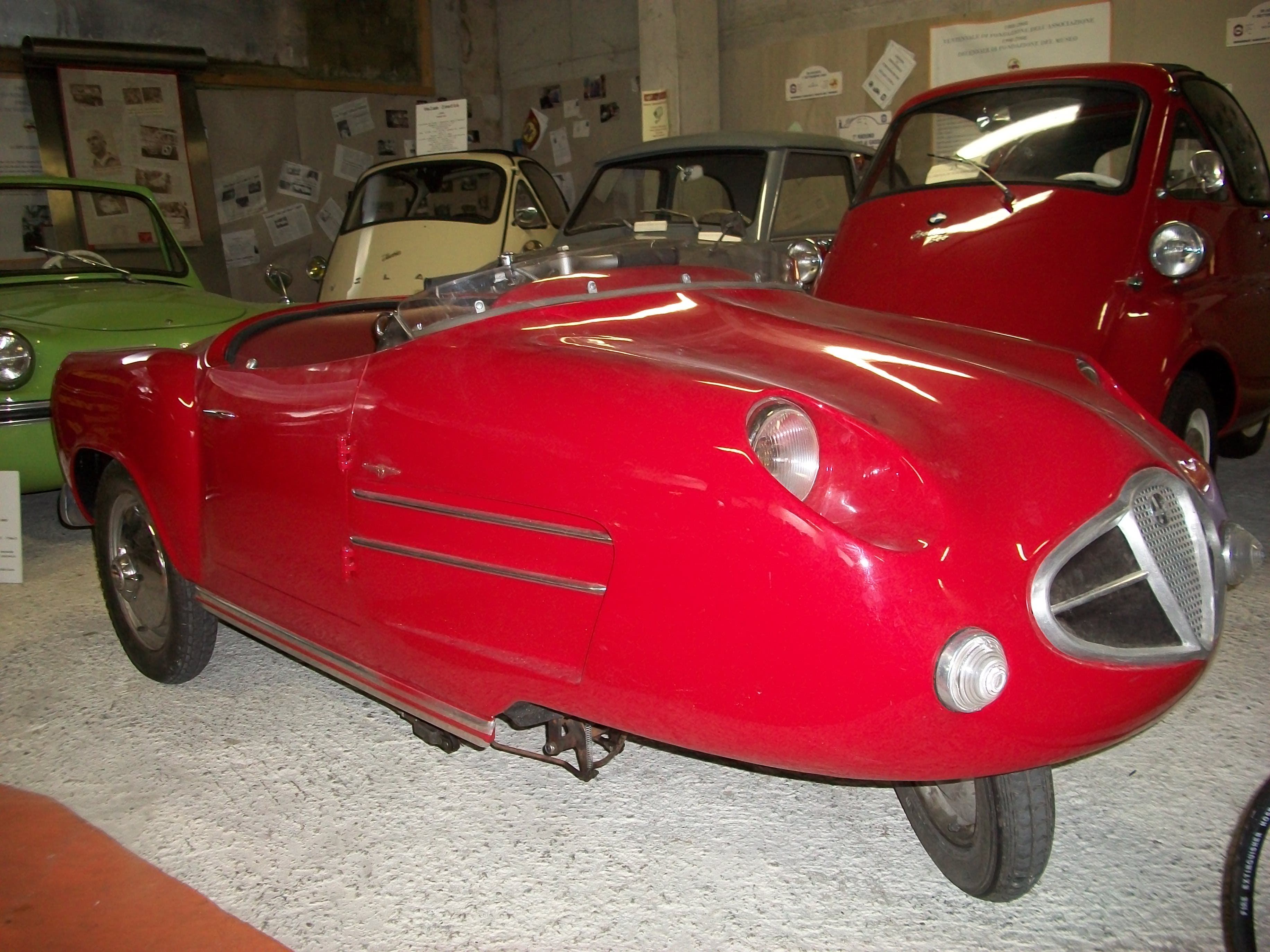 Al piano inferiore, poi, una particolarissima esposizione di microcar che tra pezzi unici ed artigianali realizzati sulle più disparate basi, annovera anche le tedesche BMW Isetta Standard cabriolet ed Export, la Janus del 1958 costruita da Zundapp in 6902 esemplari, la Masserschmitt cabrio, Spatz del 1957, l’italiano Volugrafo costruito in poche centinaia di esemplari nelle omonime officine torinesi (1946), l’inglese Trojan 604 del 1967, ed il Velorex 16/350 prodotto dalla cooperativa cecoslovacca dei fratelli Frantisek nel 1968.