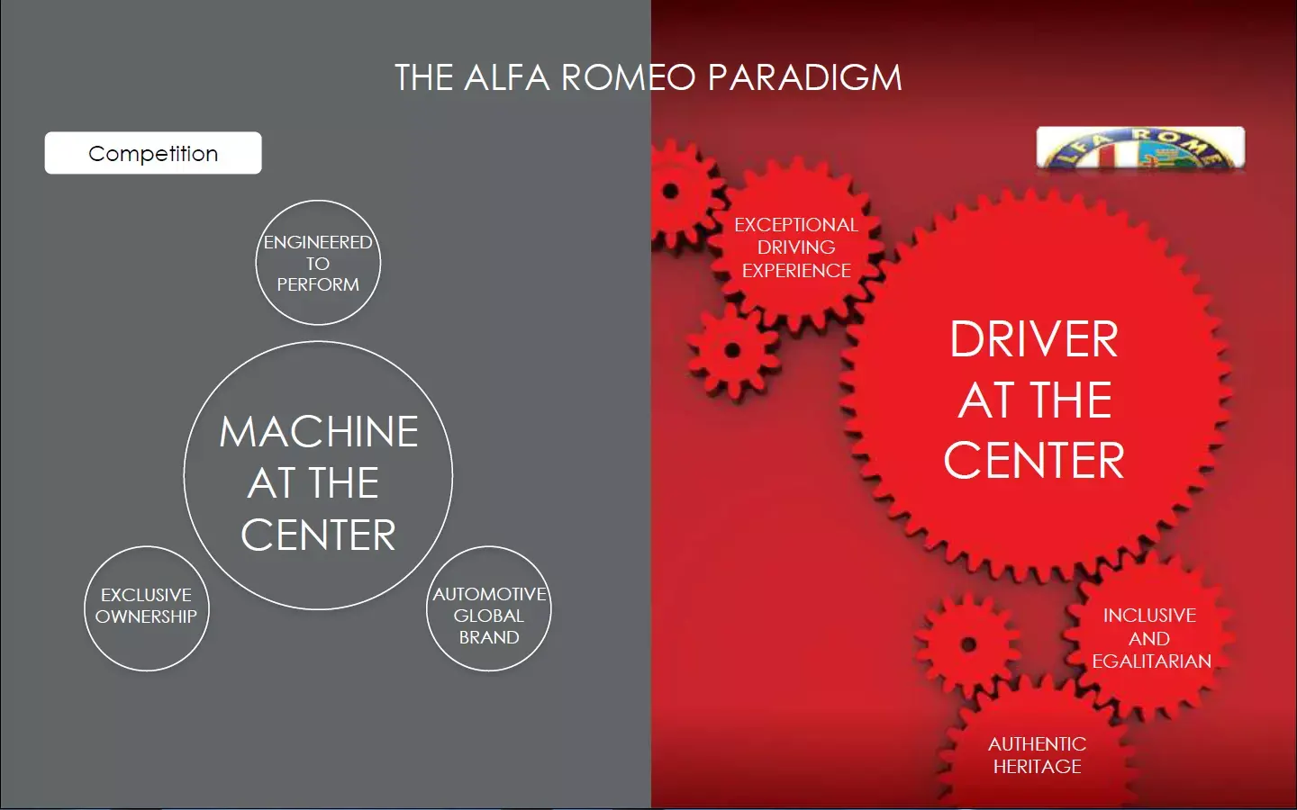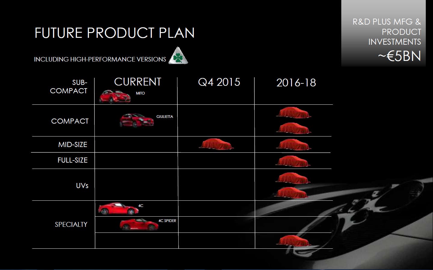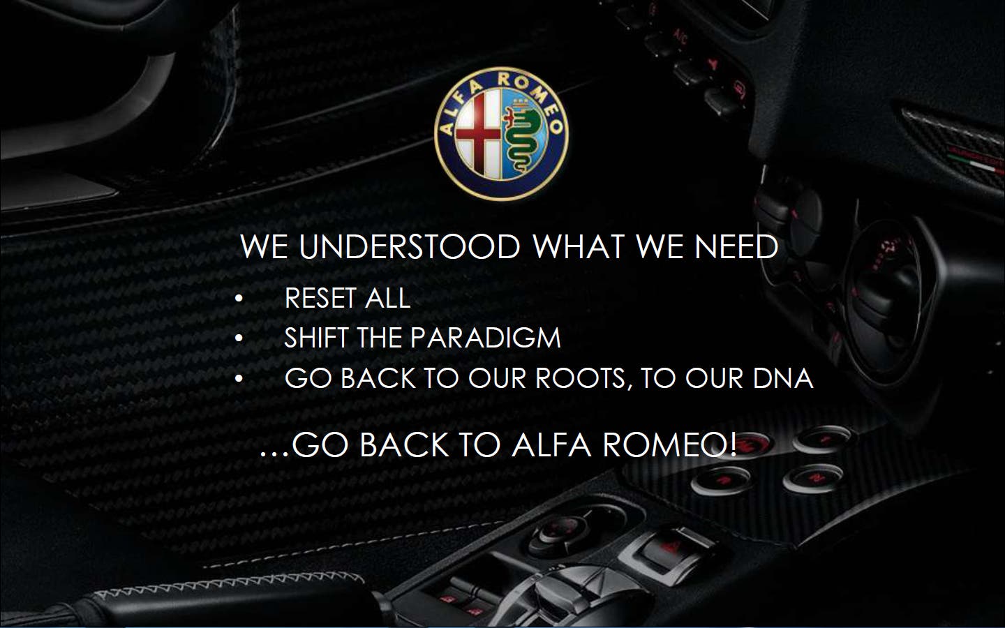 L’evento del 6 maggio 2014 segnerà un forte spartiacque nella storia del Biscione. Durante la presentazione del Product Plan dei prossimi anni, l’Alfa Romeo stessa ha sottolineato con forte autocritica i suoi limiti passati e i suoi fallimenti. Portando in esempio la Brera (2005), la 159 (2006) e la Spider (2006) viene dichiarato “Abbiamo costruito una lunga serie di bellissime vetture, incluse auto dell’anno (147 [2000] e 156 [1997]) ma abbiamo perso il DNA storico del Marchio”.