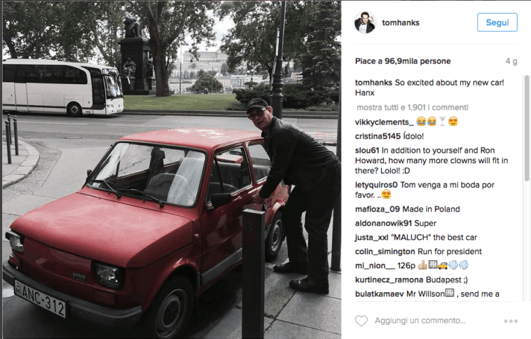 Tom Hanks, noto appassionato di automobili, ha scattato questa foto durante una visita a Budapest, anche se questo modello Fiat è particolarmente popolare in Polonia, dove Fiat 126 è stata la vettura più venduta per per molti anni e ancora oggi alcuni esemplari si possono vedere in strada. “Non volevamo perdere questa opportunità e abbiamo deciso di dare all’attore una di queste Fiat, un modo per fargli conoscere la storia della Polonia e della nostra città”, ha aggiunto Jaskólska. Si prevede che in tre o quattro mesi, il veicolo sarà già restaurato, e se Hanks non verrà a prendere il veicolo personalmente in Polonia, il piano è quello di inviare l’auto per via aerea a Los Angeles.