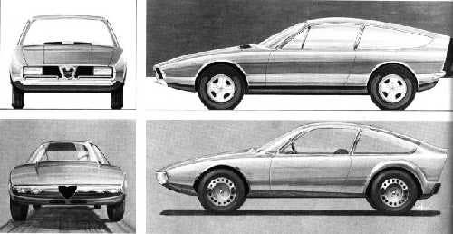 Inedito è anche il frontale, con la calandra ed i quattro fari completamente nascosti da un plexiglas trasparente, le cui uniche aperture sono costituite dallo scudetto Alfa centrale e da una “colonna” di piccole prese d’aria asimmetriche. Gli interni sono caratterizzati da un design essenziale e minimale, che reinterpreta in chiave moderna e sportiva le proporzioni della vettura di base. I sedili sono avvolgenti (con una posizione di guida distesa) e molti dettagli neri, ma le ampie superfici vetrate garantiscono comunque una buona luminosità. Grazie alla migliore profilatura aerodinamica, la velocità massima sale a 176 Km/h, una manciata in più rispetto alla Junior di Bertone.
