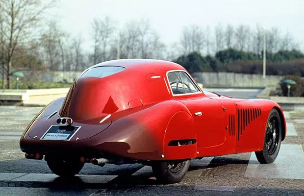 Nella Storia della Corsa vi è poi una delle più sensazionali vetture d’anteguerra: quella allestita nel 1938 dalla Touring sul telaio a passo corto (2800 mm) tipo Mille Miglia della “8C 2900B”. L’auto è una berlinetta aerodinamica che diviene protagonista della XV edizione della gara con l’equipaggio Raymond Sommer-Clemente Biondetti. Costruita sul telaio n° 412033 (sul quale viene installato il motore n° 422022 da 8 cilindri in linea biblocco con distribuzione bialbero in testa da 2926 cm³ alimentato da due carburatori e due compressori da220 CV a 5500 giri/min) è strettamente derivata da quella della monoposto Grand Prix “8C” del 1935. L’esemplare unico presenta una speciale carrozzeria Superleggera costituita da una gabbia reticolare in tubi e profilati di acciaio speciale, lastrata poi con lamiera in lega d’alluminio di vario tipo per far fronte alle sollecitazioni previste nelle diverse zone della scocca. Per ridurre il peso della carrozzeria (dichiarato in soli 180 kg), i finestrini laterali e il lunotto furono realizzati in plexiglas.