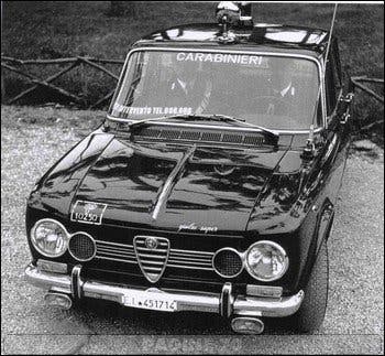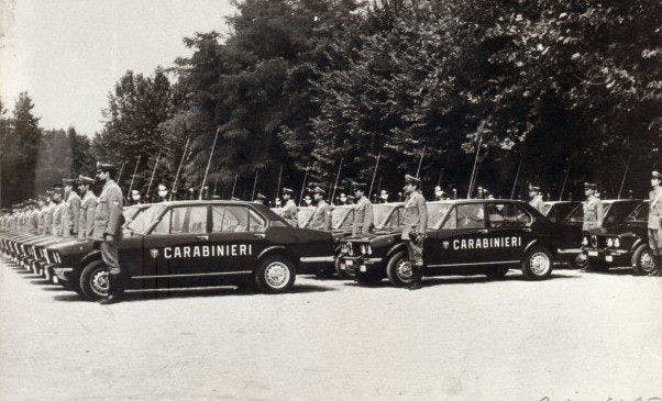 Nella primavera del 1973, il Comando Generale dell’Arma dei Carabinieri procede all’acquisto di 75 esemplari di Alfa Romeo Alfetta, da assegnare alle Legioni di Torino, Milano, Roma, Napoli e Palermo, nell’ambito della lotta alla dilagante criminalità. L’Alfetta era stata immessa in commercio nell’estate del 1972 e rappresentava un notevole balzo in avanti in materia di autovetture veloci, anche grazie alla sua ragguardevole cilindrata ( il 1800 cc.) e la sua elevata velocità di punta. L’assegnazione iniziale ai predetti Comandi di Legione era dettata non solo dalle ovvie necessità di procedere a cauti acquisti ma anche e soprattutto dal fatto che molti erano titubanti circa la possibilità di rimpiazzare la ormai “mitica” Giulia Super con automezzi che potevano non essere all’altezza del compito da svolgere.