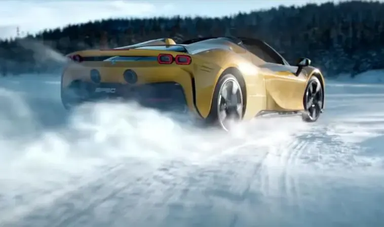 Teatro delle riprese è stato un lago ghiacciato, dove la scoperta del “cavallino rampante” si è espressa in stile WRC. Ad agevolarne le dinamiche da rally ci ha pesato la trazione integrale, supportata da tre motori elettrici. Ovviamente si è fatto ricorso, in questo caso, a speciali pneumatici chiodati, imprescindibili in un ambiente del genere.