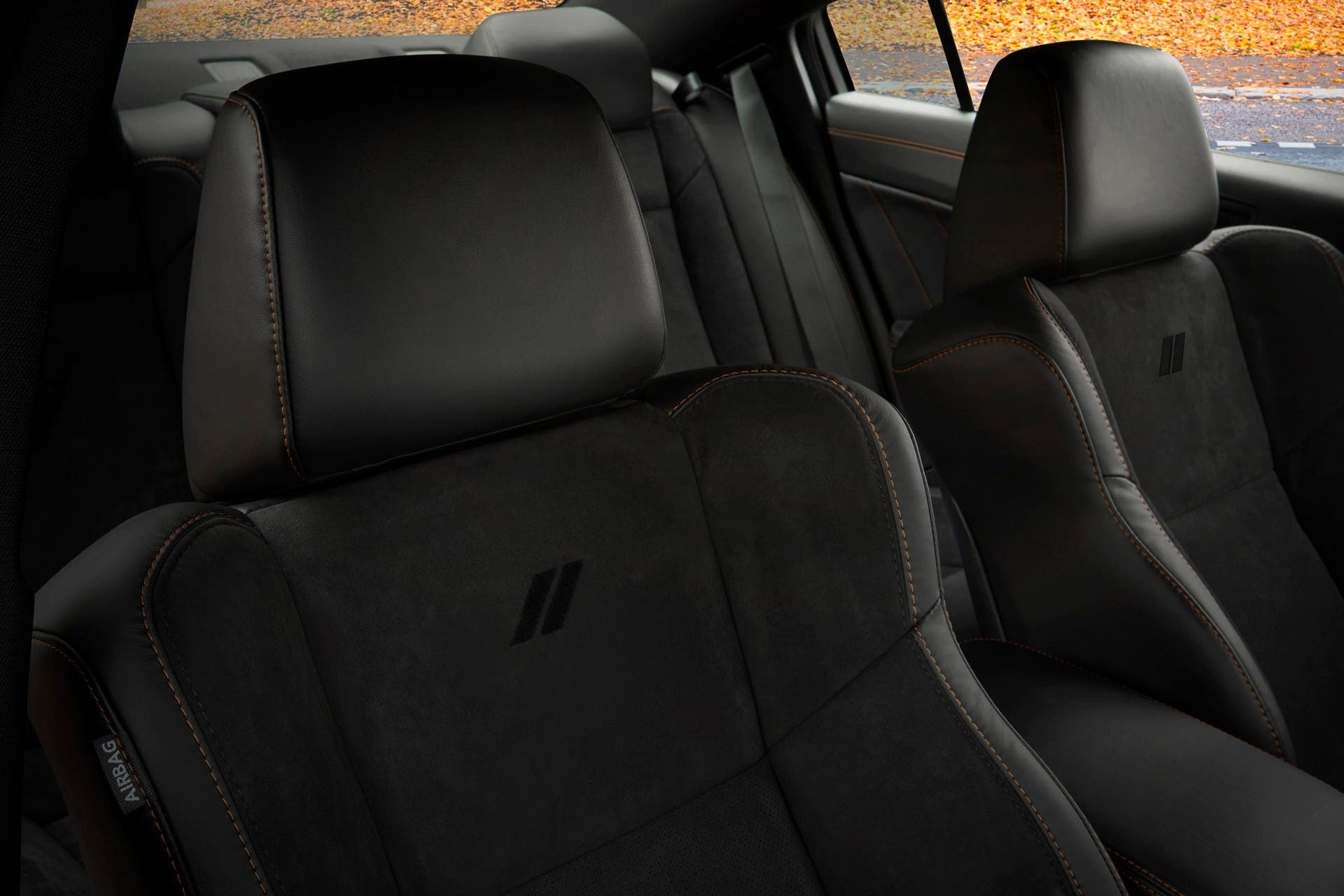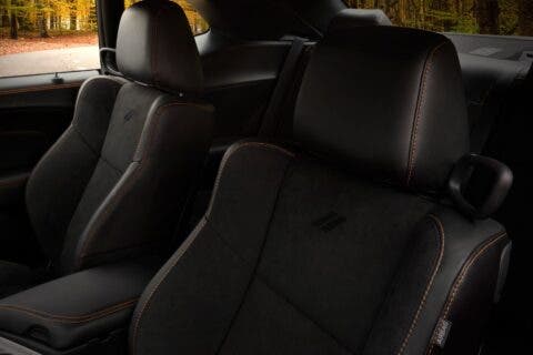 Nell’abitacolo, le cuciture arancioni impreziosiscono il quadro strumenti, la parte superiore delle portiere e il bracciolo, la plancia centrale, il pomello del cambio e il volante in pelle con fondo piatto. I sedili sono caratterizzati da cuciture arancioni e dal logo monocromatico Dodge Rhombi sullo schienale. Per le Scat Pack Widebody, è presente il beige 392 arancione e nero sul cruscotto.