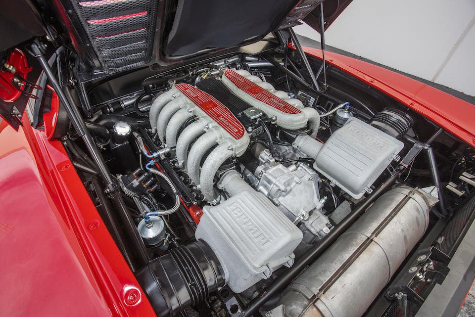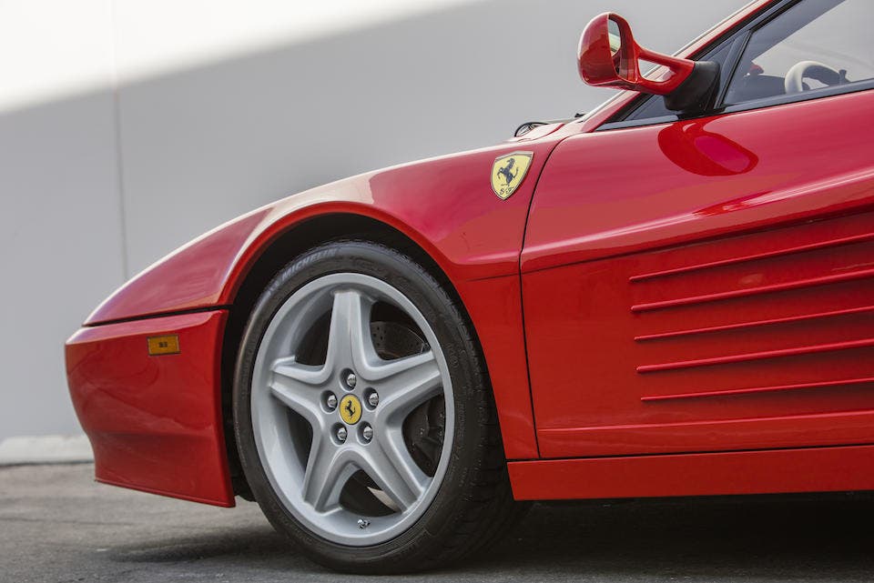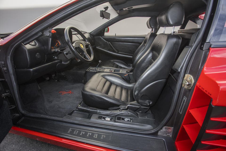 Oggi questa desiderabile Ferrari 512 TR Prototipo rimane in gran parte in condizioni originali e ben conservate, e solo 20.631 miglia (circa 33mila chilometri) sono registrate oggi sul suo contachilometri. Ci sono anche i classici cerchi in lega a 5 razze montati su pneumatici Michelin Pilot Sport e l’interno presenta i quadranti neri con scritte arancioni. Le finiture di fabbrica, le etichette e le targhette identificative rimangono intatte su tutta la vettura. Una revisione completa del motore è stata recentemente eseguita dagli specialisti Ferrari presso l’assistenza ufficiale a Las Vegas, dove sono state riviste le cinghie di distribuzione, candele, guarnizioni del coperchio delle valvole e molti altri lavori di manutenzione. Un set di valigie in pelle Schedoni su misura si trova nello scomparto anteriore, così come i libretti di fabbrica e la cassetta degli attrezzi all’interno di scatole di pelle.