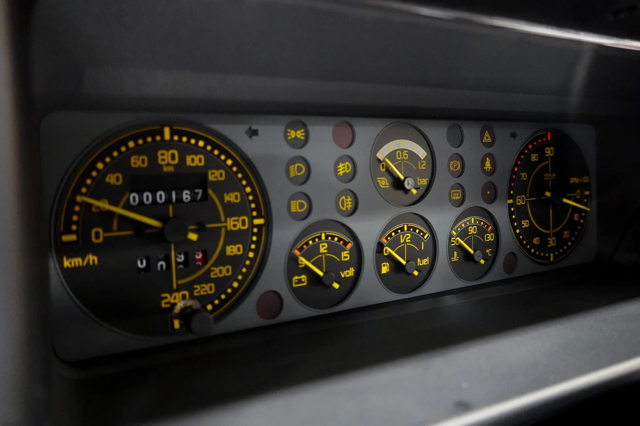 Sulla Lancia Delta Integrale venduta all’asta per oltre 250mila dollari troviamo anche un volante a tre razze che incornicia la strumentazione Veglia con indicatori gialli con tachimetro dotato di un fondo corsa da 240 km/h, un contagiri con una linea rossa di 6.500 giri/min e indicatori per la pressione di sovralimentazione, tensione della batteria, temperatura del liquido di raffreddamento e livello del carburante. Il tratto più caratteristico rimane quindi il contachilometri meccanico a sei cifre che indica solamente 168 chilometri percorsi.