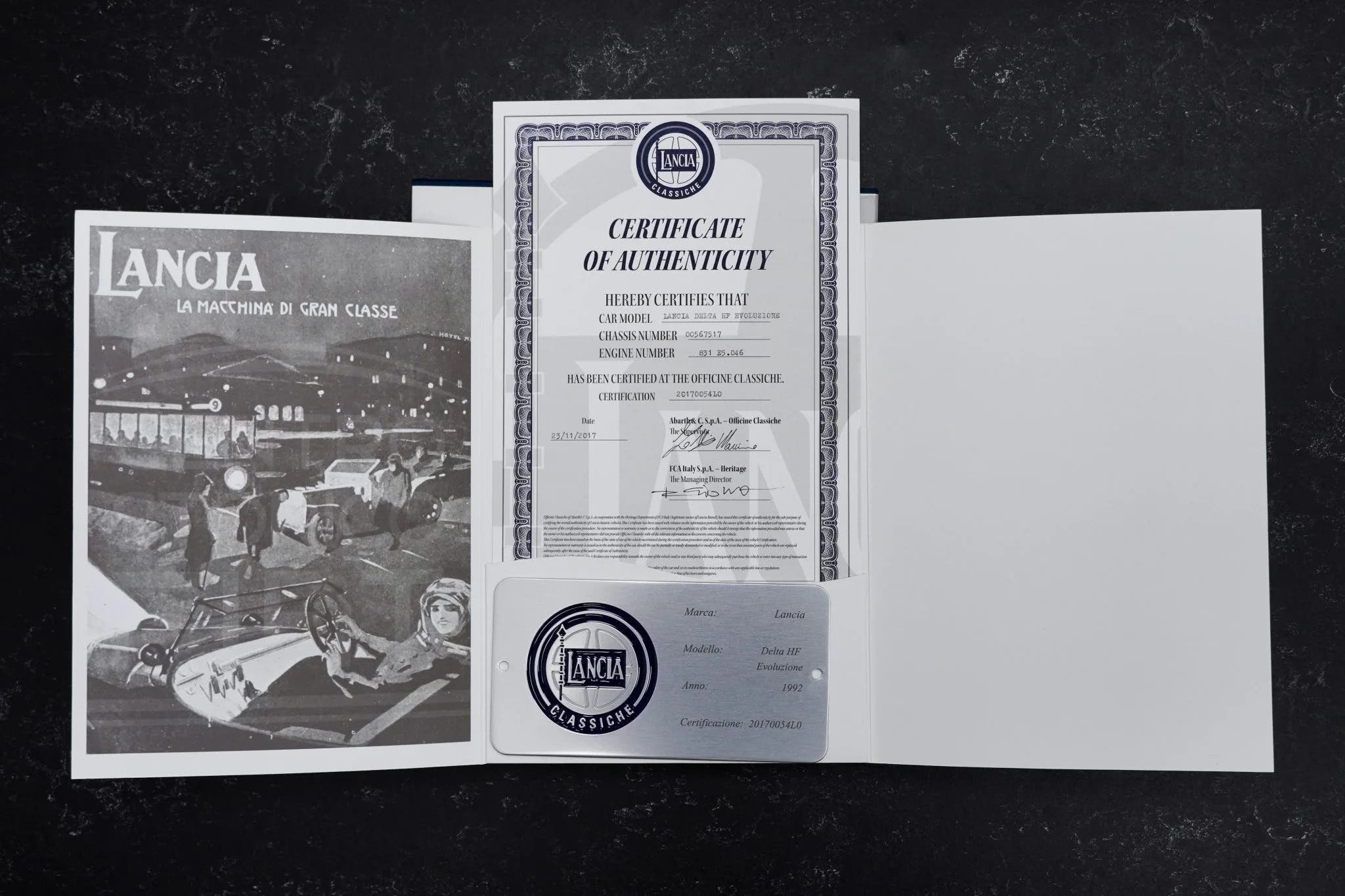 L’equipaggiamento di serie include i cerchi ruota Speedline da 15 pollici bianchi con pneumatici Michelin MXX 205/50, freni a disco dotati di sistema antibloccaggio sulle quattro ruote, cofano ventilato, uno spoiler posteriore regolabile, sedili sportivi Recaro all’anteriore, aria condizionata e uno stereo con lettore di cassette AM/FM Clarion. La bella Lancia Delta Integrale Martini 5 Evoluzione del 1992 è anche provvista di un telo copriauto, una cassetta degli attrezzi con cric, pezzi di ricambio, un certificato di autenticità Lancia Classiche del 2017 e la documentazione del costruttore.