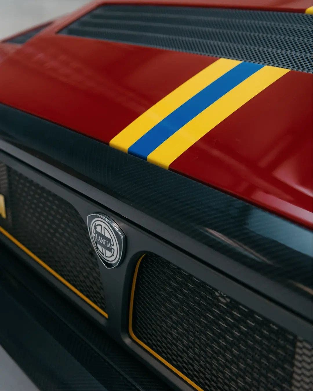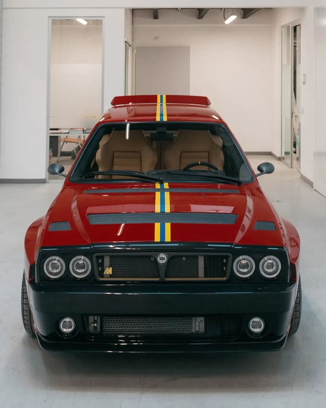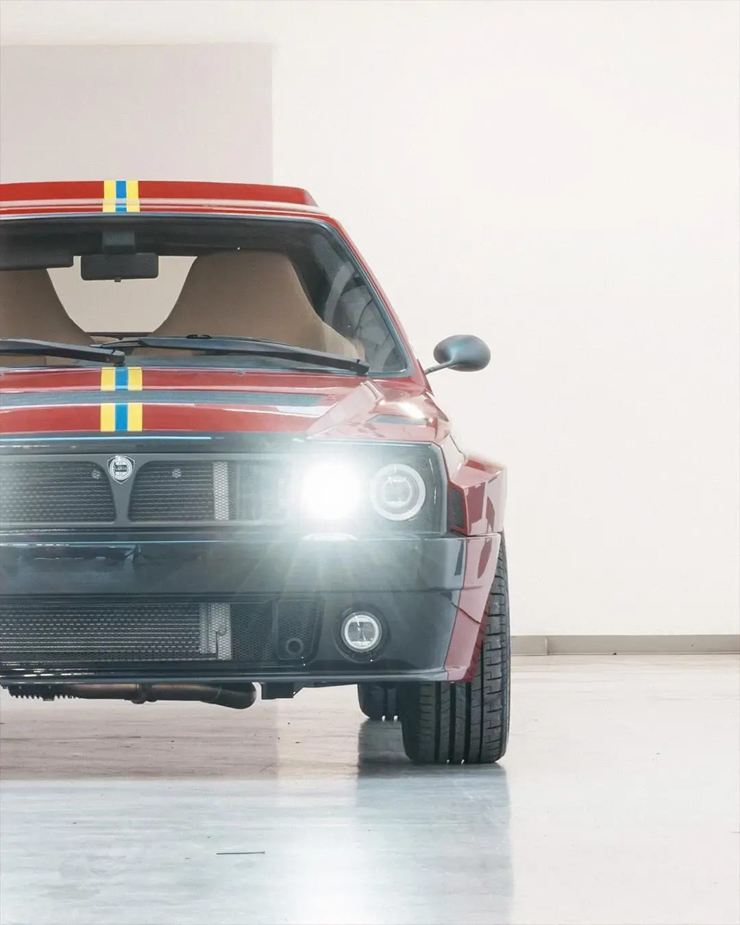 Al centro della Lancia Delta Futurista nella speciale livrea Final Edition realizzata da Automobili Amos insiste proprio la caratterizzazione stilistica apportata. La carrozzeria è stata trattata con un rosso amaranto piuttosto elegante, abbinato a strisce gialle e blu nei colori della Lancia HF di un tempo con cerchi in lega in grigio antracite. Se all’epoca sulla Lancia Delta erano stati riutilizzati i gruppi ottici della Integrale 16V realizzata in precedenza, sulla Futurista questi vengono sostituiti da nuove luci a LED integrate nel paraurti in fibra di carbonio in nero lucido.