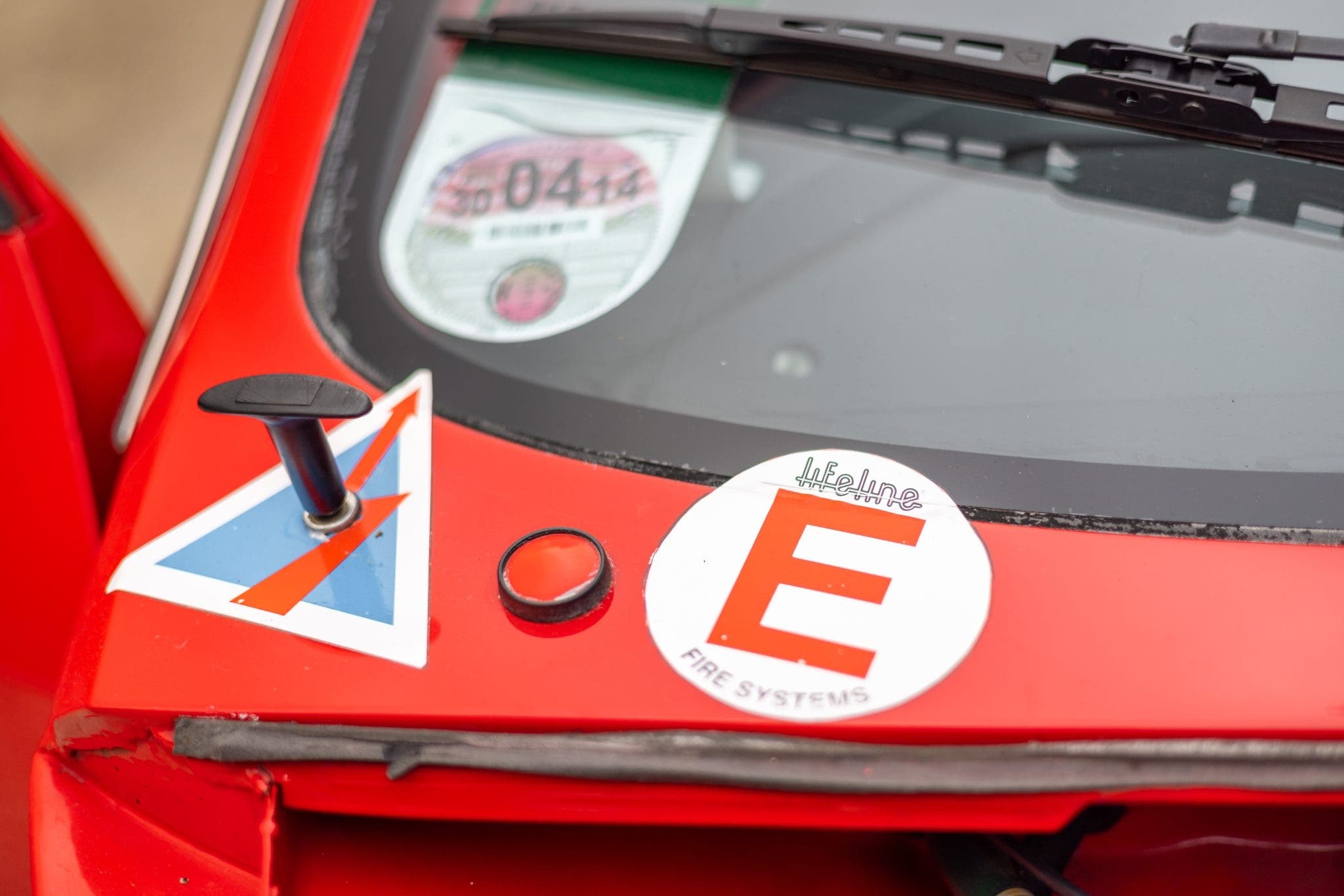 L’abitacolo di questa Lancia Rally 037 prevede una coppia di sedili da corsa Sparco rivestiti in tessuto nero e una moquette nera presente sul pavimento e sul retro. Altre caratteristiche includono roll-bar rossa, cruscotto e pannelli delle portiere in nero opaco, pedali forati e un estintore montato sul tunnel centrale.