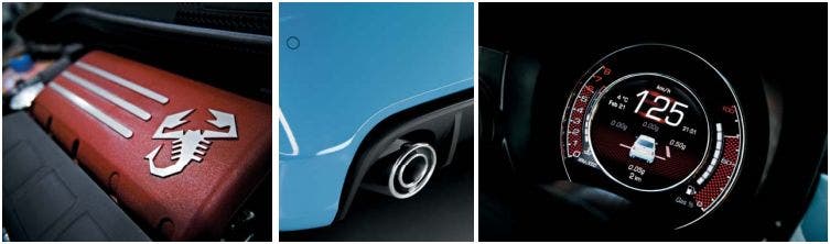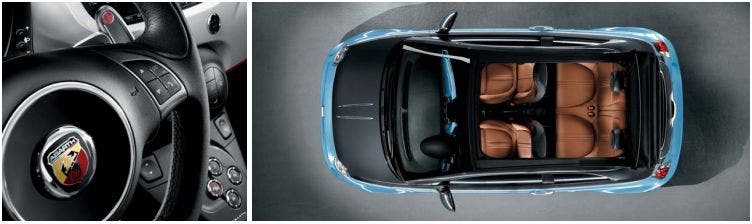 Analizzando l’interno delle due versioni, l’Abarth 500 Custom è caratterizzata dalla presenza di una capote in tessuto disponibile in diversi colori (nero e grigio), sedili in pelle e spoiler in tinta. Il volante è stato costruito con vicini i comandi di controllo della radio e il quadro strumenti con display radio da 7 pollici e tecnologia TFT. Mopar ha curato l’interno dell’Abarth 500 Scorpion con pelle Katzkin, cuciture di colore e finiture dettagliate. Altre opzioni interne dell’Abarth Scorpion 500 saranno disponibili allìinterno del Mopar Custom Shop.