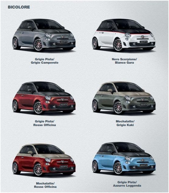 Dal 2008 ad oggi, l’Abarth 500 è stata aggiornata e diversificata dando vita a nuove versioni Gran Turismo, Special Edition, fuori serie ogni volta mantenendo la forma della storica 500 e personalizzando soprattutto i colori e gli interni. La gamma prevede diversi stili di colorazione e sei modelli specifici bicolore, l’Abarth 500 Scorpion si può comparare alla versione Nero S./Bianco Gara e al Mochalatte/ Rosso Officina, per l’intensità del colore rosso e l’inversione delle due cromature che vengono valorizzate dal grande Logo stampato davanti.