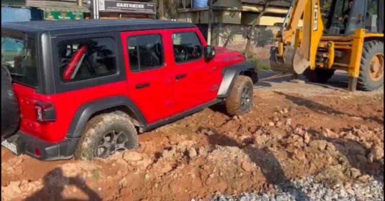 Una Jeep Wrangler rimane bloccata nel fango in India: necessario l’aiuto di una ruspa
