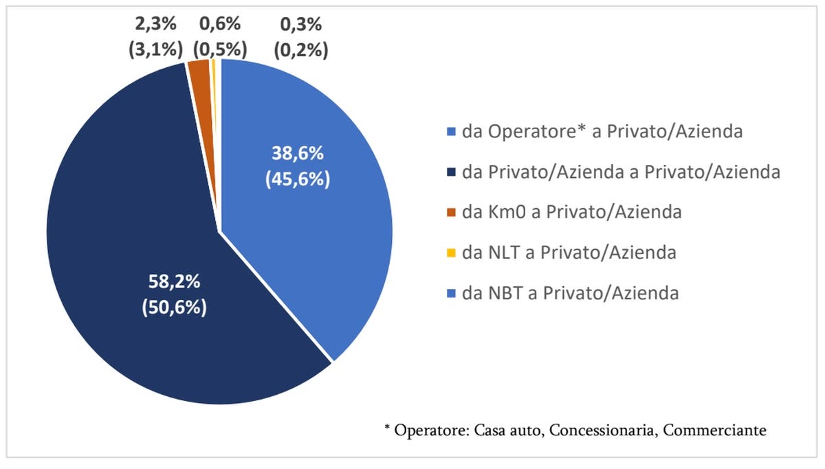 Gli scambi tra privati/aziende si confermano in crescita al 58,2% di tutti i passaggi di proprietà (+7,6% sul 2022), per la minore disponibilità di auto presso le reti di vendita. Sono scesi al 38,6% quelli da operatore a cliente finale mentre sono cresciuti quelli provenienti dal noleggio (0,9% complessivo) e hanno perso lo 0,8% quelli da km 0 (al 2,3%).