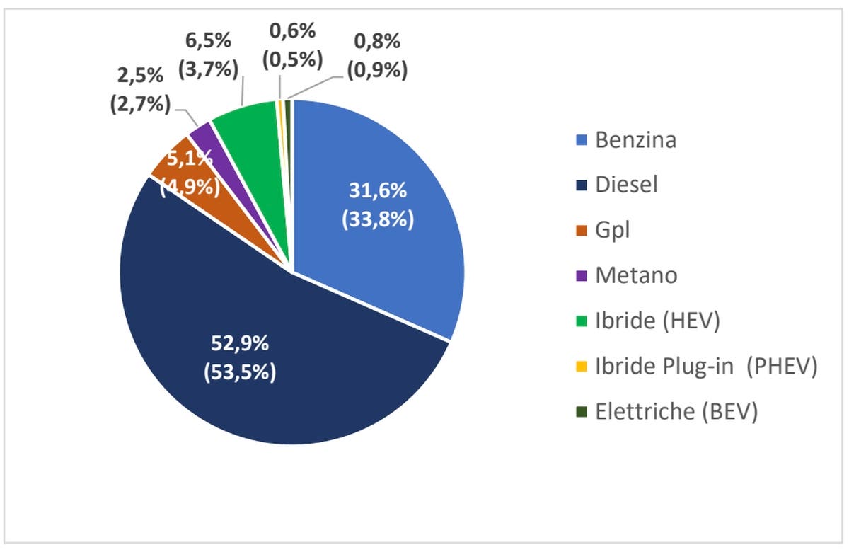 Il GPL si è piazzato al terzo posto (al 4,4% del totale), poco distante dalle ibride, al quarto, con il 4,2% di quota. Il metano è salito al 2,5% mentre i trasferimenti netti di auto 100% elettriche e ibride plug-in si sono posizionate allo 0,4% ciascuno.