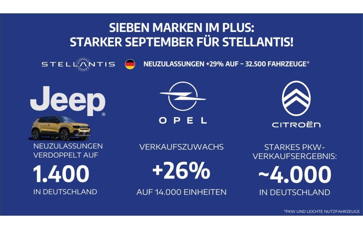 I marchi del gruppo Stellantis hanno concluso con successo il terzo trimestre del 2023 in Germania con un forte slancio finale. Secondo i dati dell’Autorità federale dei trasporti automobilistici, sono state immatricolate in totale circa 32 mila automobili degli otto marchi del gruppo automobilistico attualmente attivi in quel paese, ovvero un aumento del 29 per cento rispetto allo stesso periodo dello scorso anno. Sette marchi hanno registrato vendite positive.