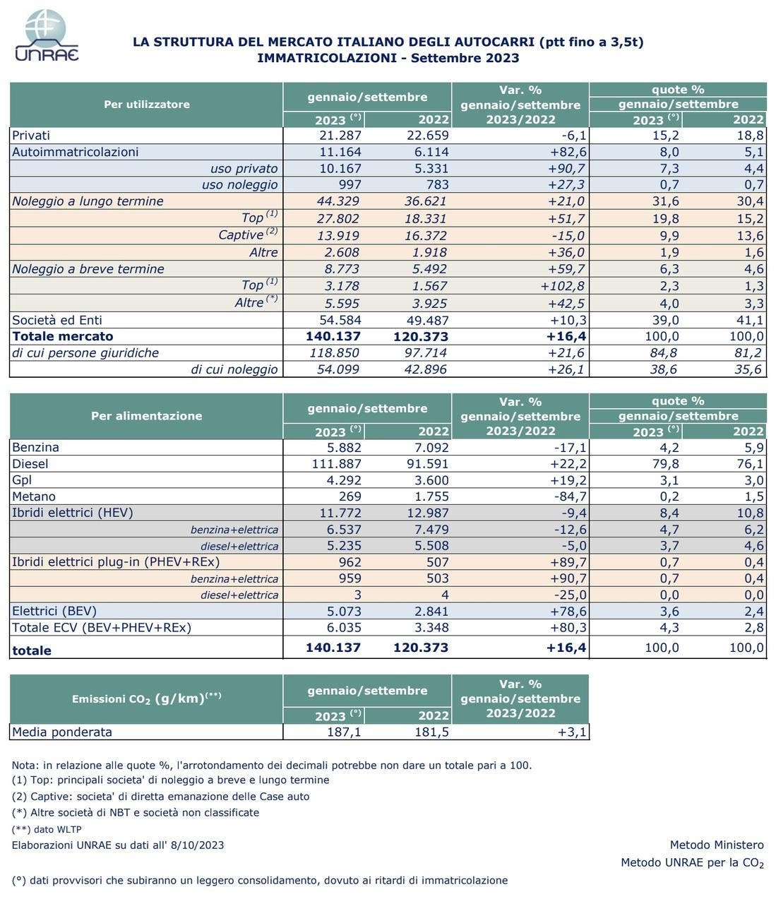 In Italia, la dinamica del mercato dei veicoli commerciali continua a mostrare segni positivi. A settembre 2023, le immatricolazioni hanno segnato un’impennata, registrando un incremento del 43,1% rispetto all’anno precedente con 17.670 unità, in contrasto alle 12.345 di settembre 2022. Se esaminiamo l’intero arco dei primi nove mesi dell’anno, la crescita si attesta al 16,5%: 140.222 veicoli nuovi contro i 120.372 dello stesso periodo del 2022.