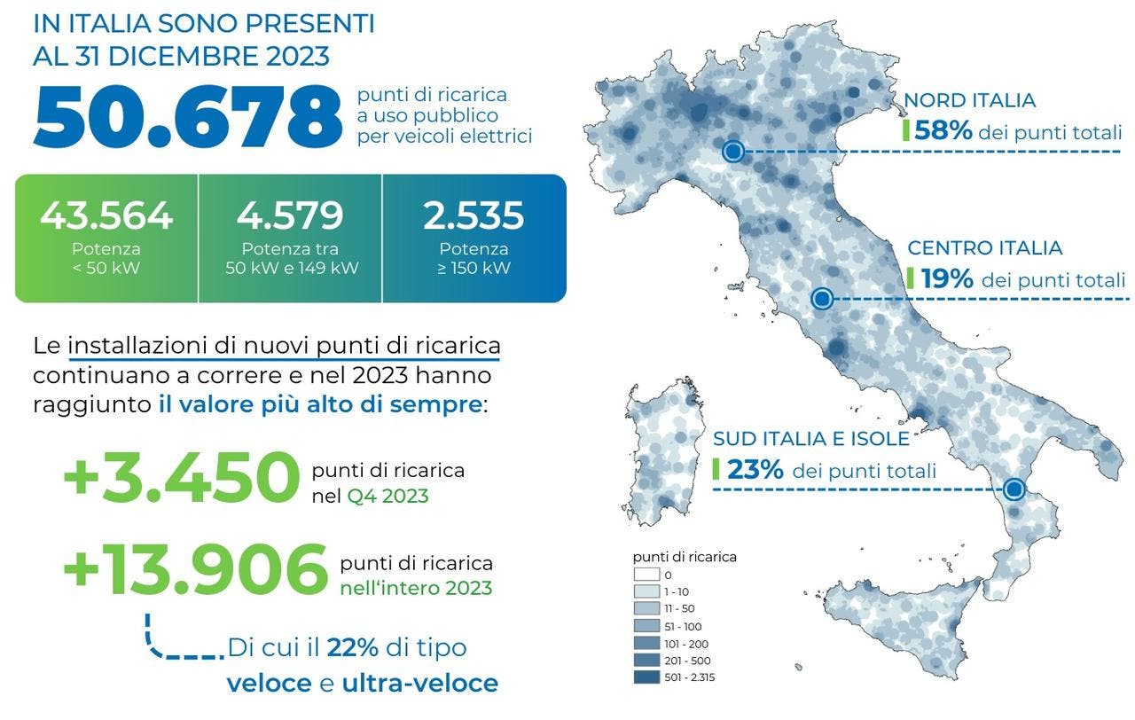 In particolare, l’Italia ha registrato un aumento notevole di punti di ricarica a uso pubblico lo scorso anno, raggiungendo 50.678 unità, con un incremento del 38% rispetto all’anno precedente. Tale ampliamento della rete di ricarica è importante per supportare la transizione verso la mobilità elettrica.