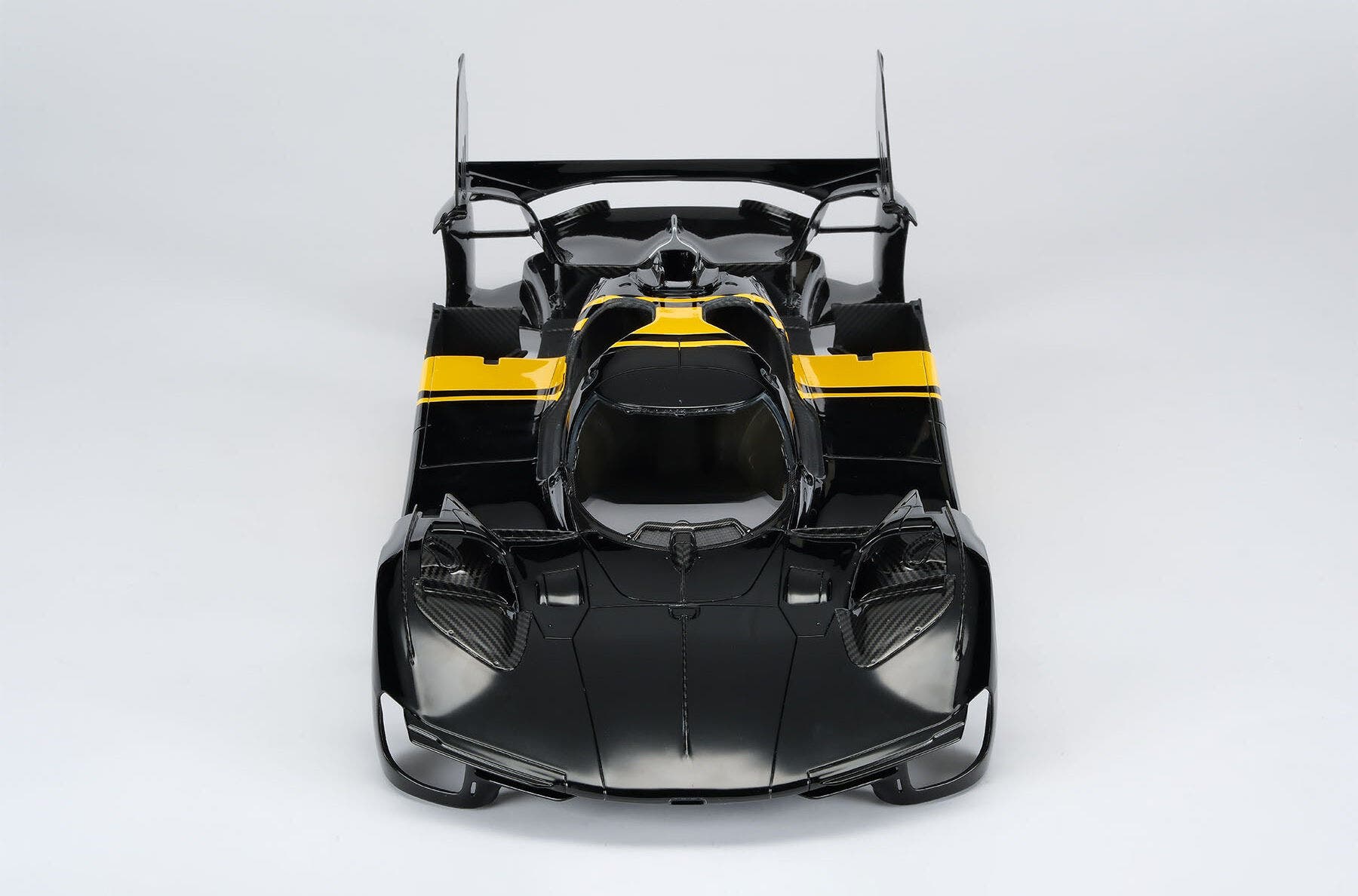 La Ferrari 499P Modificata del ricco committente è stata fedelmente imitata in ogni dettaglio, per quanto nascosto alla vista. Questa si chiama eccellenza produttiva. Incredibile la pazienza e la maestria degli artigiani che hanno reso possibile tutto ciò, giovandosi dei progetti CAD originali e delle specifiche dei materiali forniti direttamente dalla casa di Maranello. Nel caso specifico, la tinta usata è un Nero Stellato con strisce da corsa in Giallo e tondi in bianco. Il numero 44 è in bella evidenza, come sull’auto in formato reale.