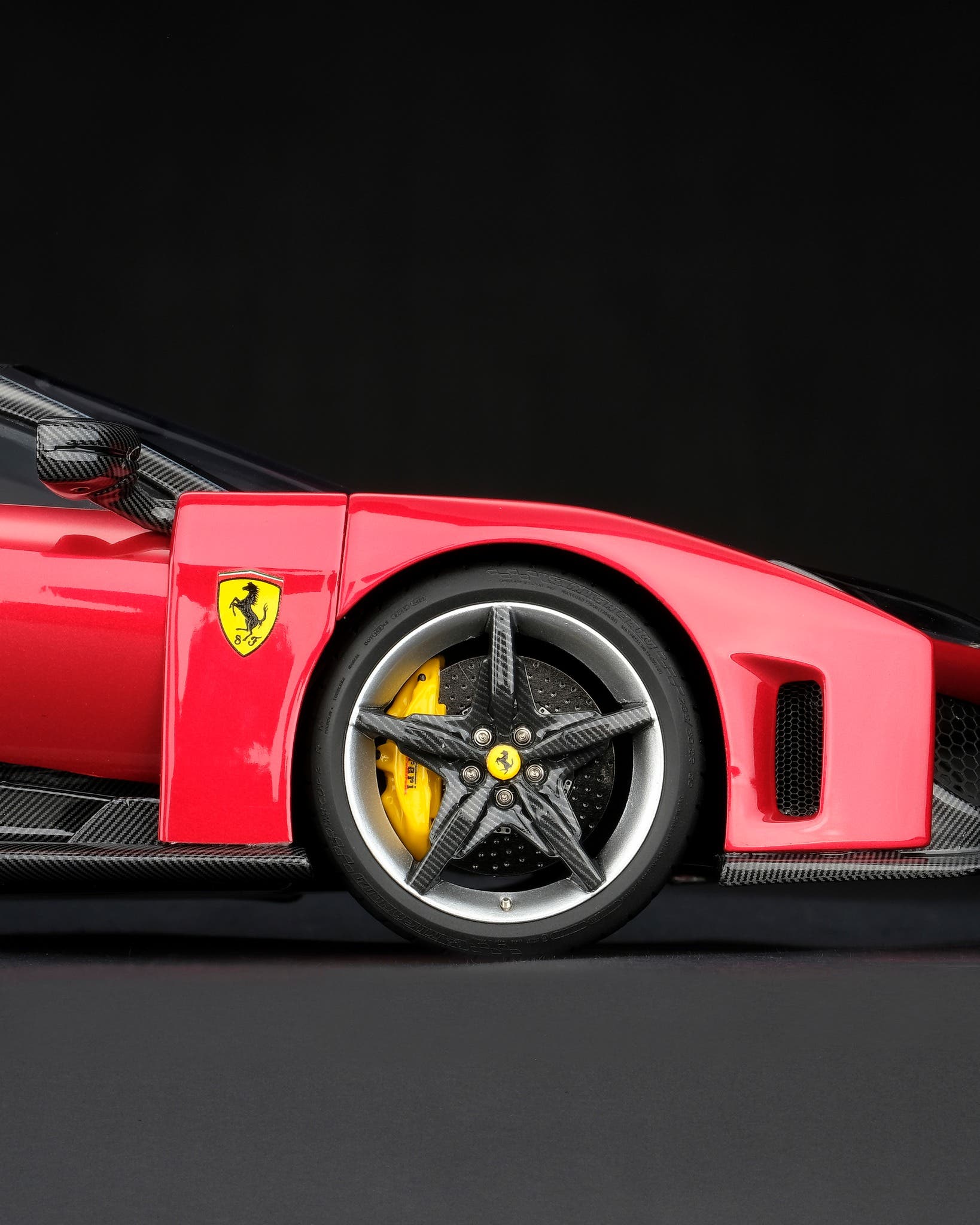 Oltre 800 ore sono state richieste dallo sviluppo del modello, giovandosi dei progetti CAD originali e delle schede materiali fornite direttamente dalla casa di Maranello. Tutte le parti sono progettate con estrema precisione, utilizzando materiali di adeguato lignaggio.