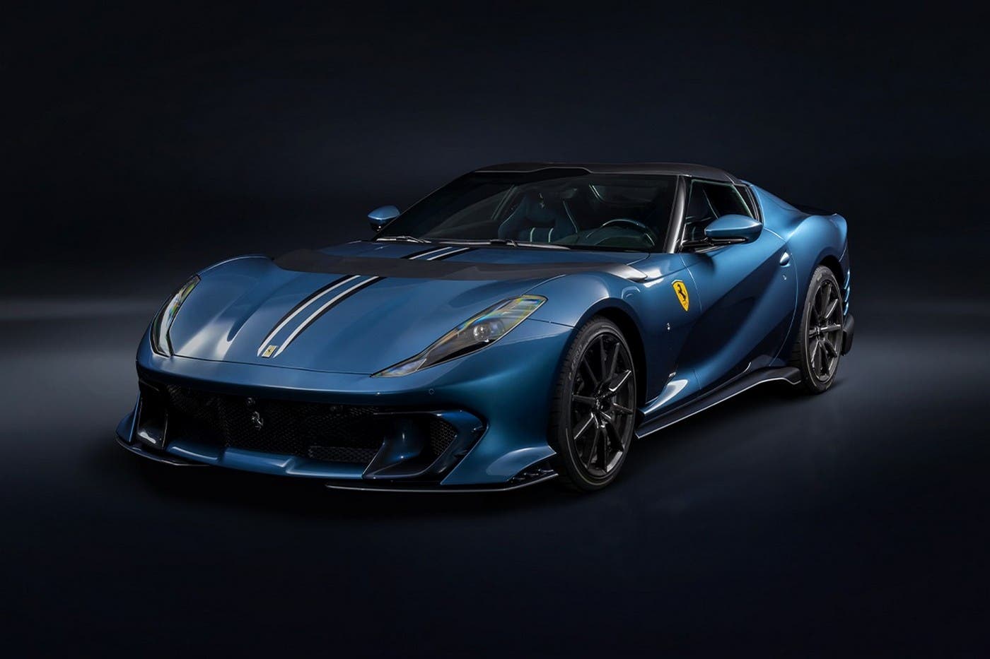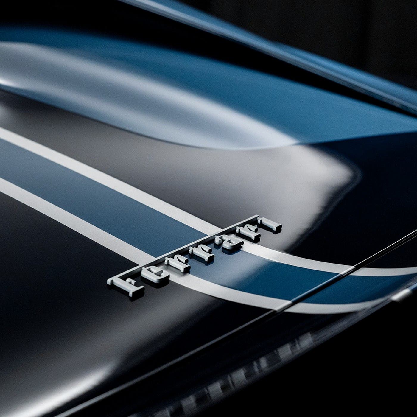 Il gioco delle nuance produce un effetto scenico davvero affascinante, che ben si sposa ai lineamenti dell’auto, senza spegnerne i muscoli, sua cifra distintiva. Anche l’abitacolo è stato trattato in modo coerente, con sedili in Alcantara blu impreziositi da cuciture metallizzate in argento, tutto coronato da raffinati distintivi Ferrari.