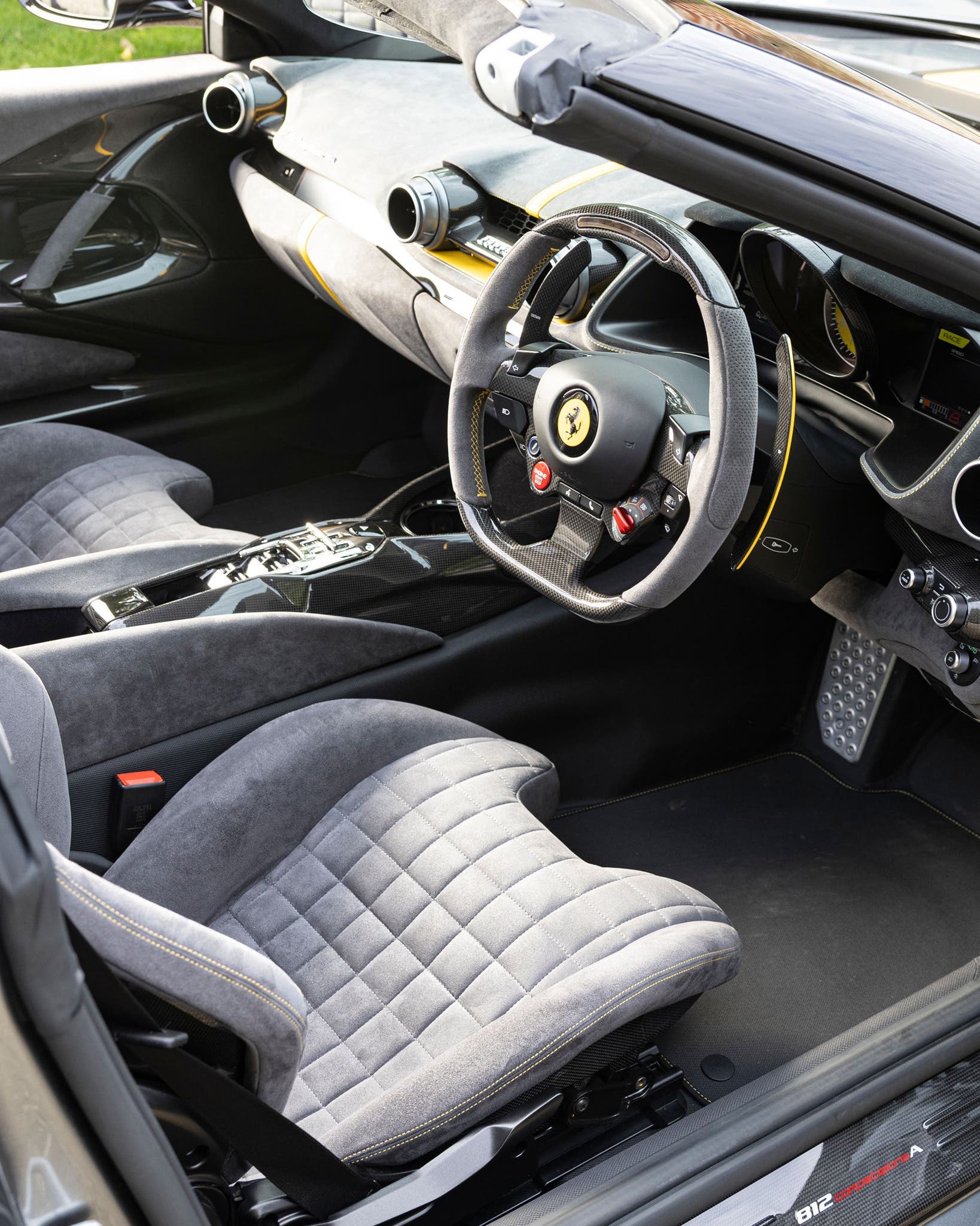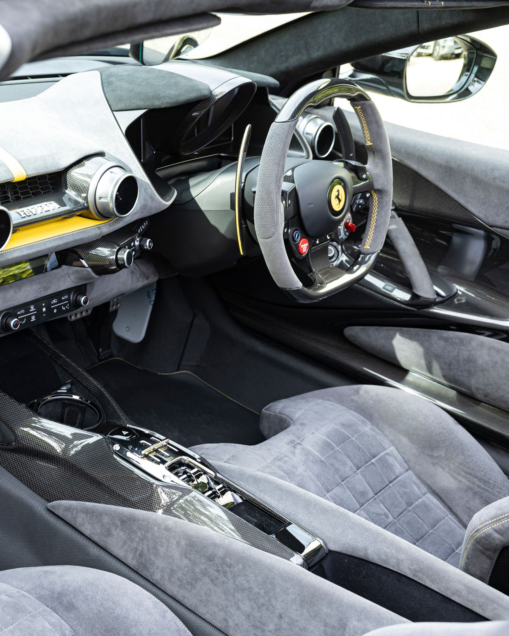 Fra i plus di questa Ferrari 812 Competizione A, meritano di essere menzionati i tanti optional, che ne esaltano ulteriormente l’esclusività. Fuori si notano le pinze freno Nero Lucido abbinate a cerchi in lega Nero Opaco, gli scudetti Scuderia aerografati sui parafanghi e la colorazione gialla per il font e la fascia degli pneumatici Pirelli P Zero.