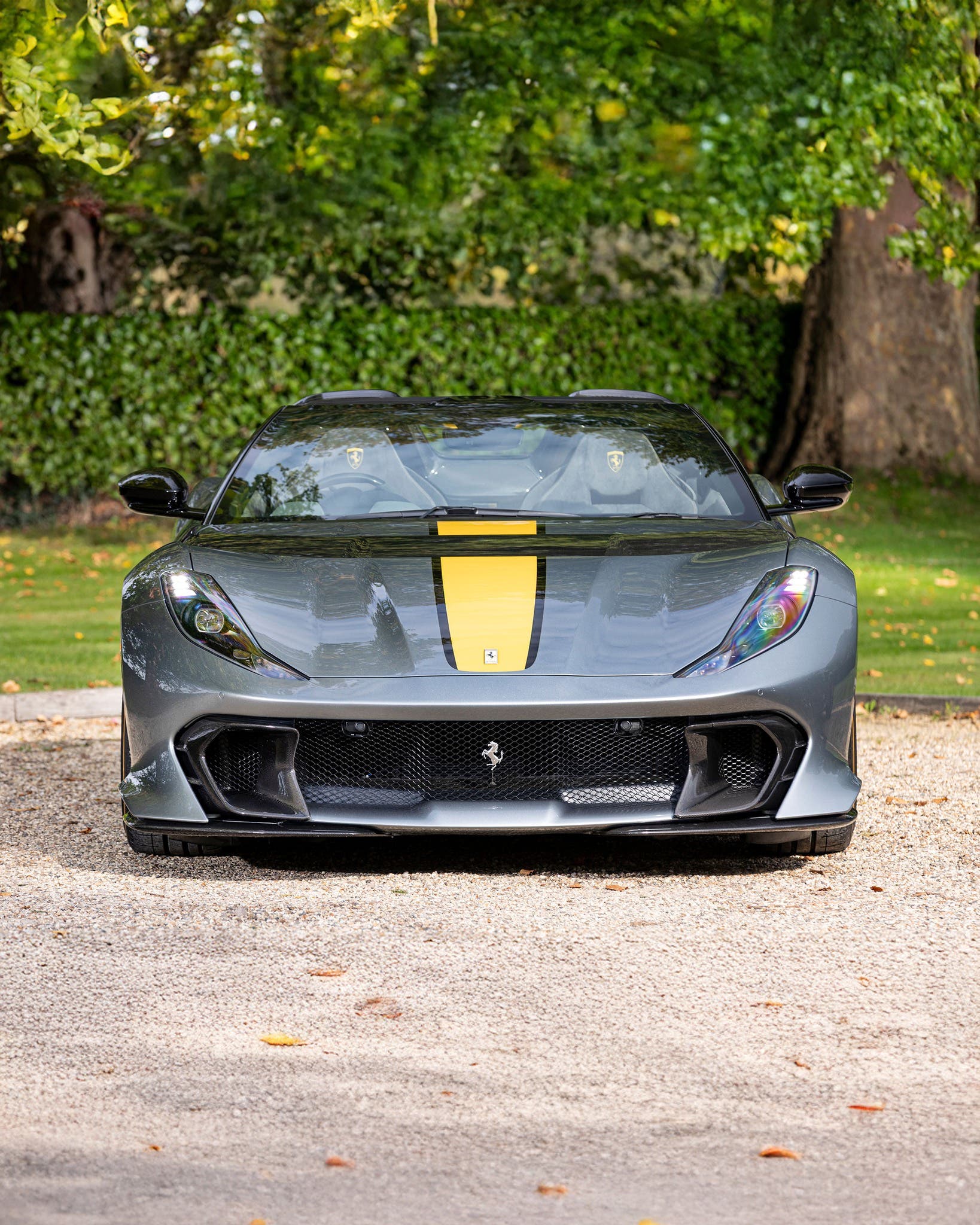 La carrozzeria offre una finitura in Grigio Competizione, con striscia centrale Giallo Triplo Strato lucido e bordi esterni in Nero. Gli interni in Alcantara antracite, con dettagli yellow, completano il pacchetto visivo. Fra i punti di forza della Ferrari 812 Competizione A in esame, merita di essere menzionata la bassa percorrenza. Da nuova ha macinato soltanto 273 miglia.