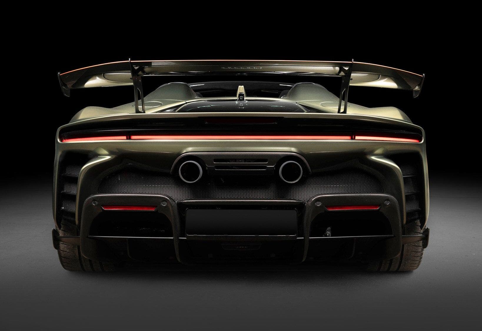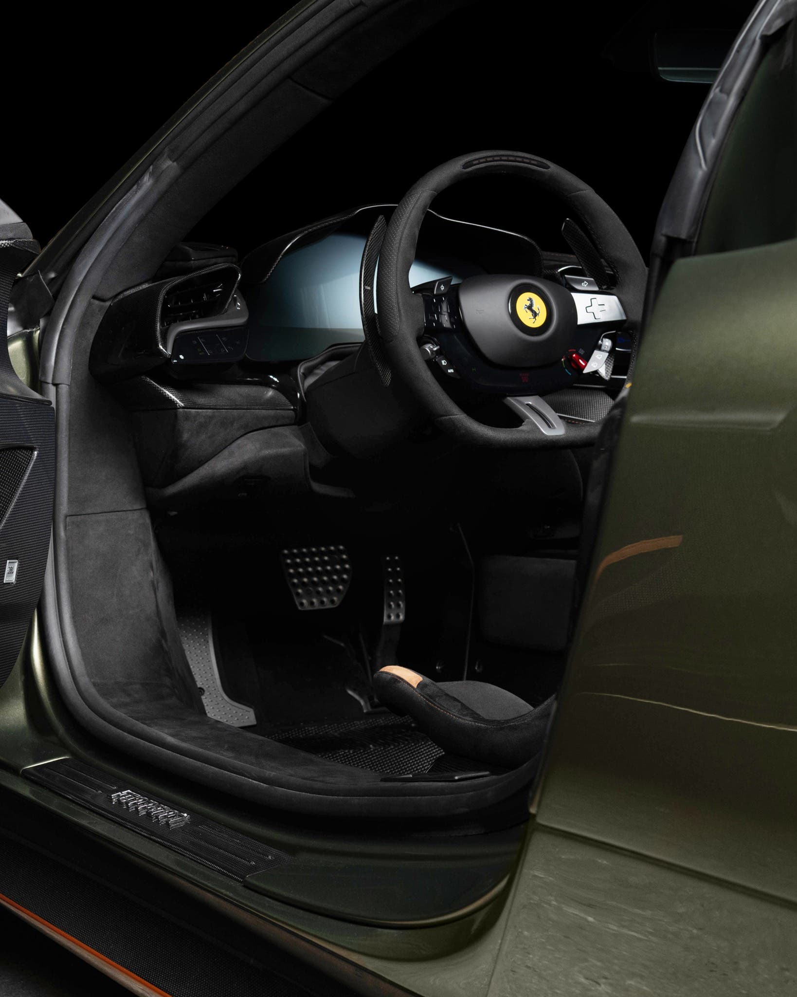 L’esemplare proposto nell’asta di Abu Dhabi è nato nel 2024. Si presenta con un allestimento molto specifico. Qui per la finitura esterna si è scelto un Extra Range Verde Masoni, abbinato a scudetti della scuderia aerografati. Nell’abito si notano gli accenti Dark Amber. In linea con quanto accade con le altre unità della stessa famiglia, anche qui c’è ampio uso di fibra di carbonio. Il prezioso ingrediente è stato usato per gli splitter, per il diffusore posteriore, per la copertura motore e molto altro. Persino i tappi delle ruote sono plasmati in questo materiale. Per proteggere il tutto, è stata applicata in fabbrica una pellicola protettiva anti-pietrisco. Le pinze dei freni color oro sbucano da splendidi cerchi forgiati e diamantati.