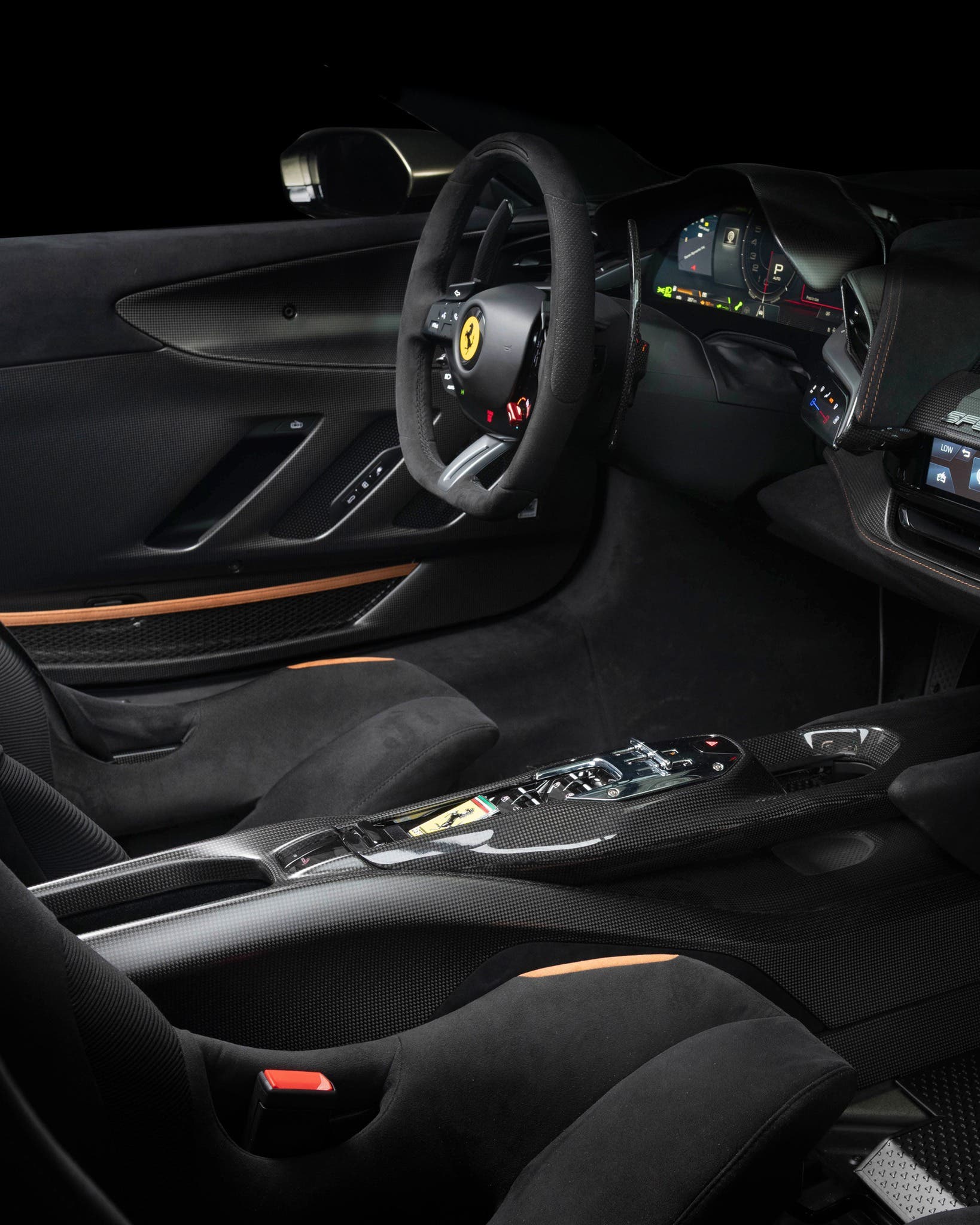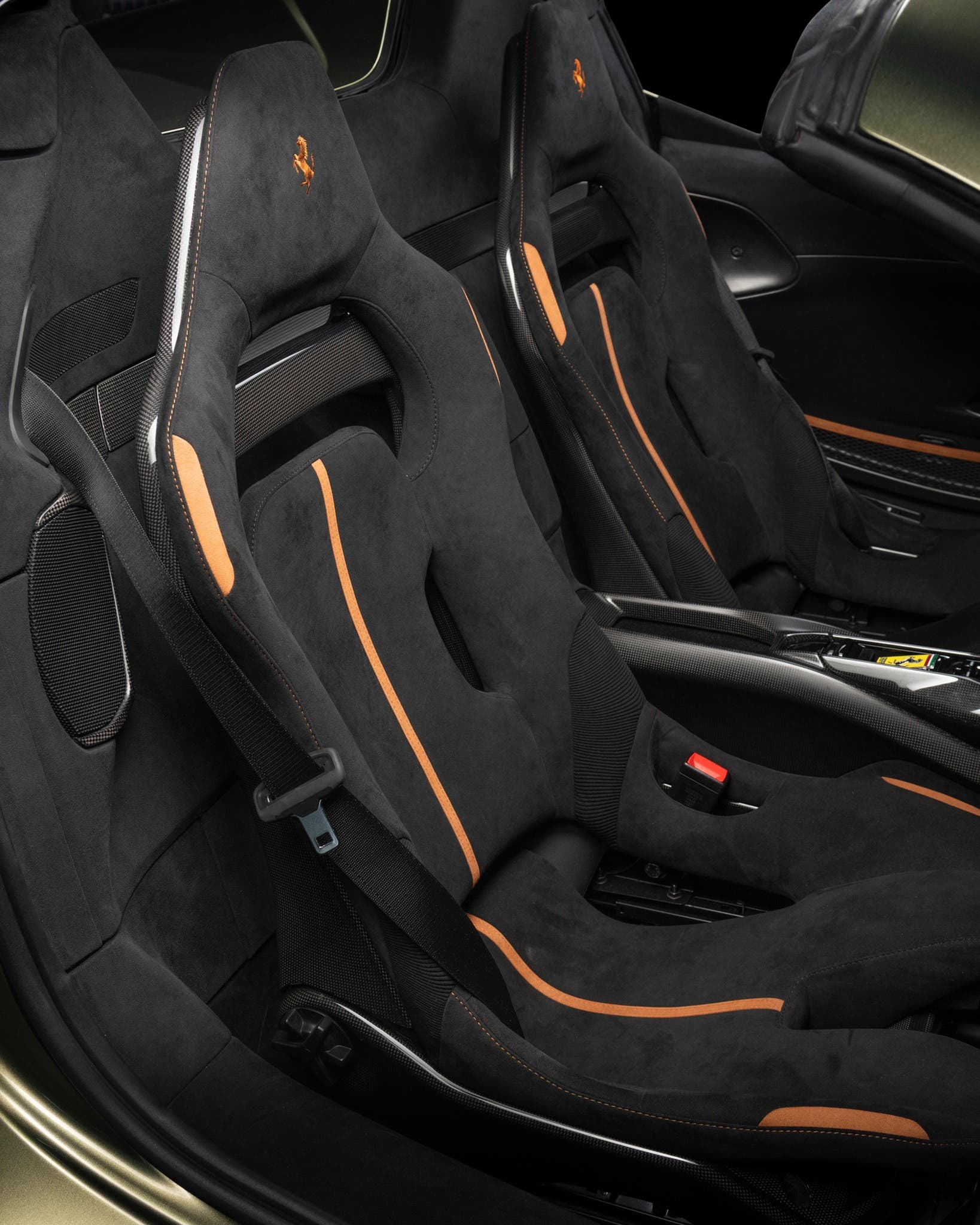Nell’abitacolo prende forma un accostamento fra l’Alcantara nera extra range, le sottili cuciture in cuoio, gli emblemi del cavallino ricamati sui poggiatesta e le trame hi-tech dei materiali compositi, che avvolgono il posto guida. L’aspetto è racing, ma il conducente e il passeggero stanno comodi a bordo. Nessun problema di spazio, come accade su altre supercar estreme e iper-specialistiche come questa. Grazie all’accurato lavoro aerodinamico svolto dagli ingegneri del “cavallino rampante”, la Ferrari SF90 XX Spider riesce a produrre fino a 530 chilogrammi di deportanza, a 250 km/h. Una cifra doppia rispetto alla versione “standard”. Le appendici fisse e quelle attive lavorano in perfetta simbiosi, per regalare la massima efficienza nelle diverse condizioni operative.