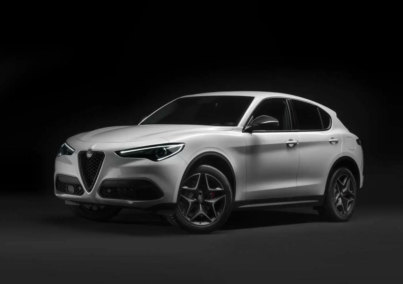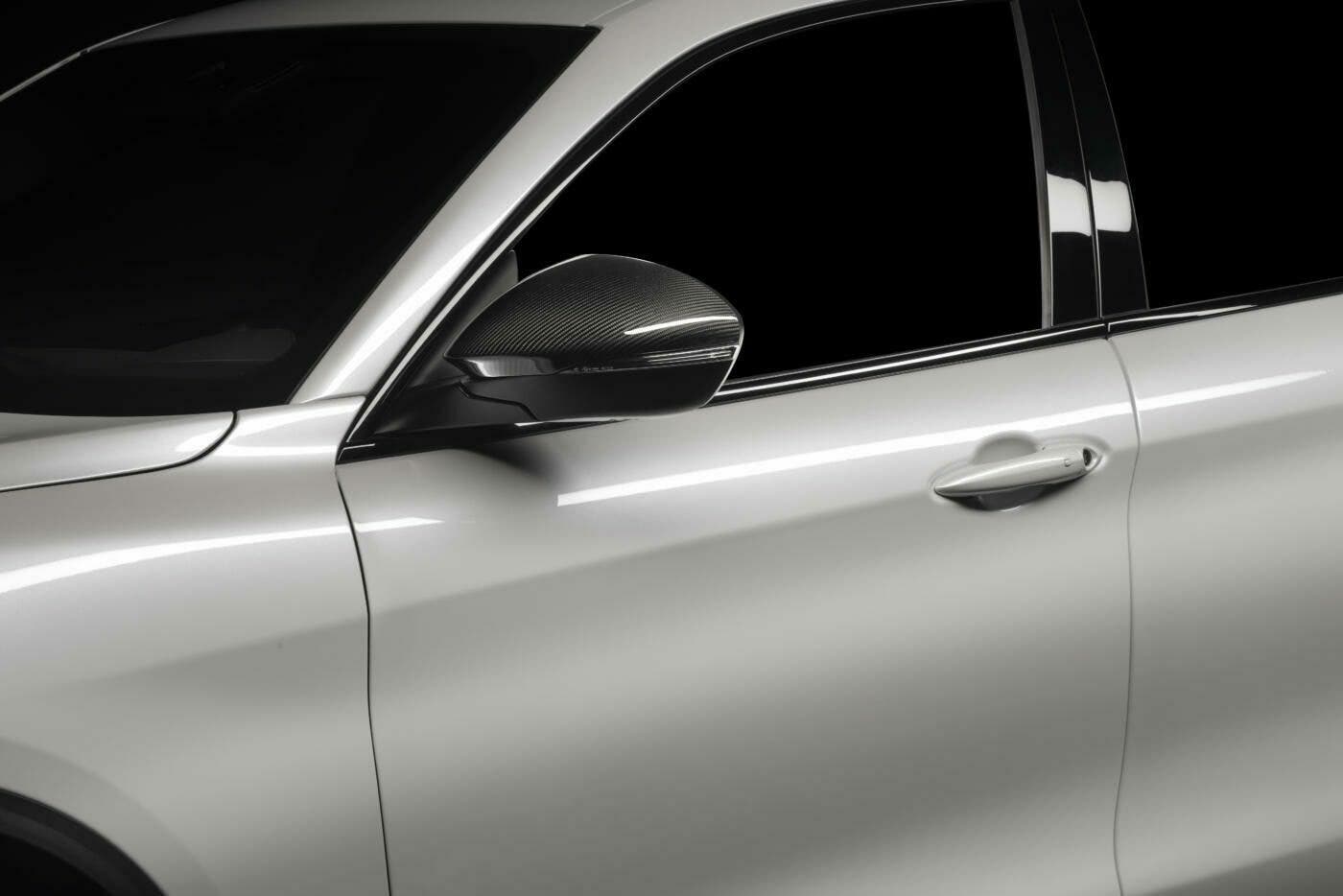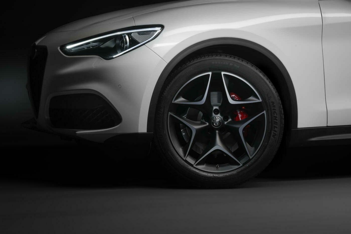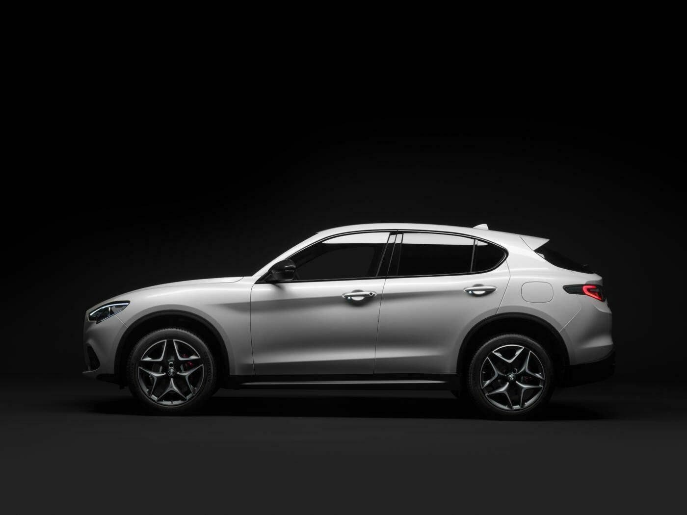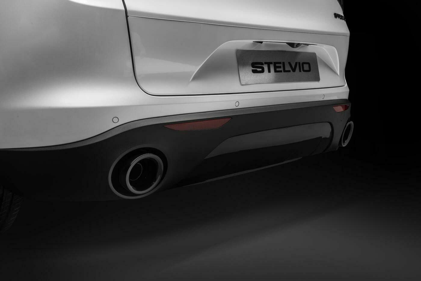 Alfa Romeo Stelvio Ti si caratterizza esteticamente parlando per la presenza di una livrea Blu Misano, nuovi fanali posteriori bruniti e prestigiosi dettagli in carbonio. Questi ultimi li ritroviamo nel trilobo frontale e nelle calotte degli specchietti retrovisori. Segnaliamo ancora cerchi in lega scuri da 20″ in combinazione con pinze freno gialle, le cornici dei cristalli esterni in nero lucido così come i terminali di scarico, i badge “Stelvio” e “Q4” scuri e i vetri privacy.
