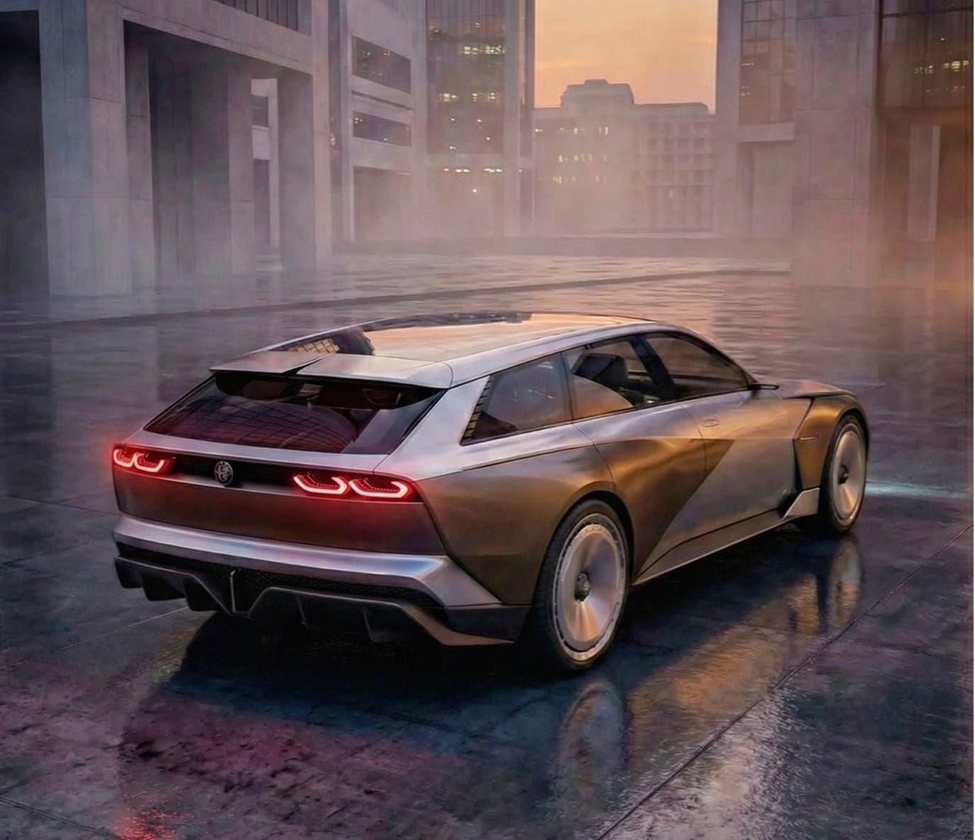 Questa Alfa Romeo station wagon concept di Bruno Callegarin reinterpreta il DNA del Biscione attraverso un linguaggio estetico radicale e fortemente contemporaneo. Il tratto distintivo del progetto è l’assenza quasi totale di curve. La carrozzeria è costruita su sfaccettature geometriche nette, superfici poligonali e spigoli marcati che conferiscono al veicolo un carattere aggressivo e futuristico. Ogni linea sembra essere una linea di tensione, studiata per trasmettere dinamismo anche da ferma. È una visione che rompe con la tradizione più morbida del design automobilistico italiano, ma che mantiene intatta la vocazione sportiva tipica di Alfa Romeo.