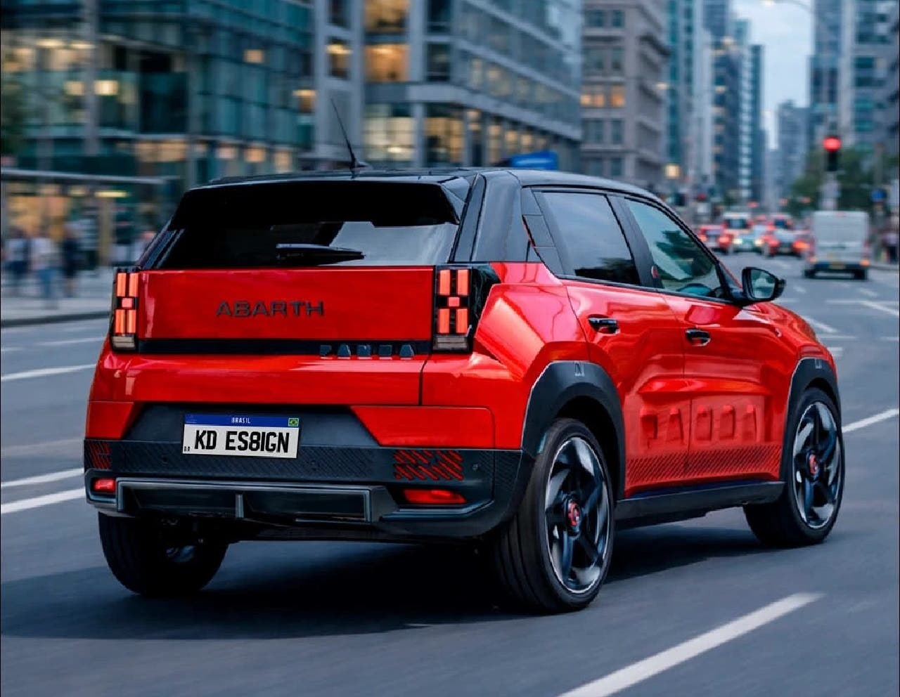 Al posteriore spiccano i fanali verticali a LED, un lunotto scuro e un paraurti scolpito con dettagli racing. L’abitacolo, visibile in un’altra immagine, appare moderno e tecnologico, con display digitale, infotainment orizzontale, volante sportivo Abarth e finiture rosse a contrasto. Nel complesso, il render propone una Grande Panda Abarth dal look deciso, giovane e fortemente orientato alla sportività urbana.