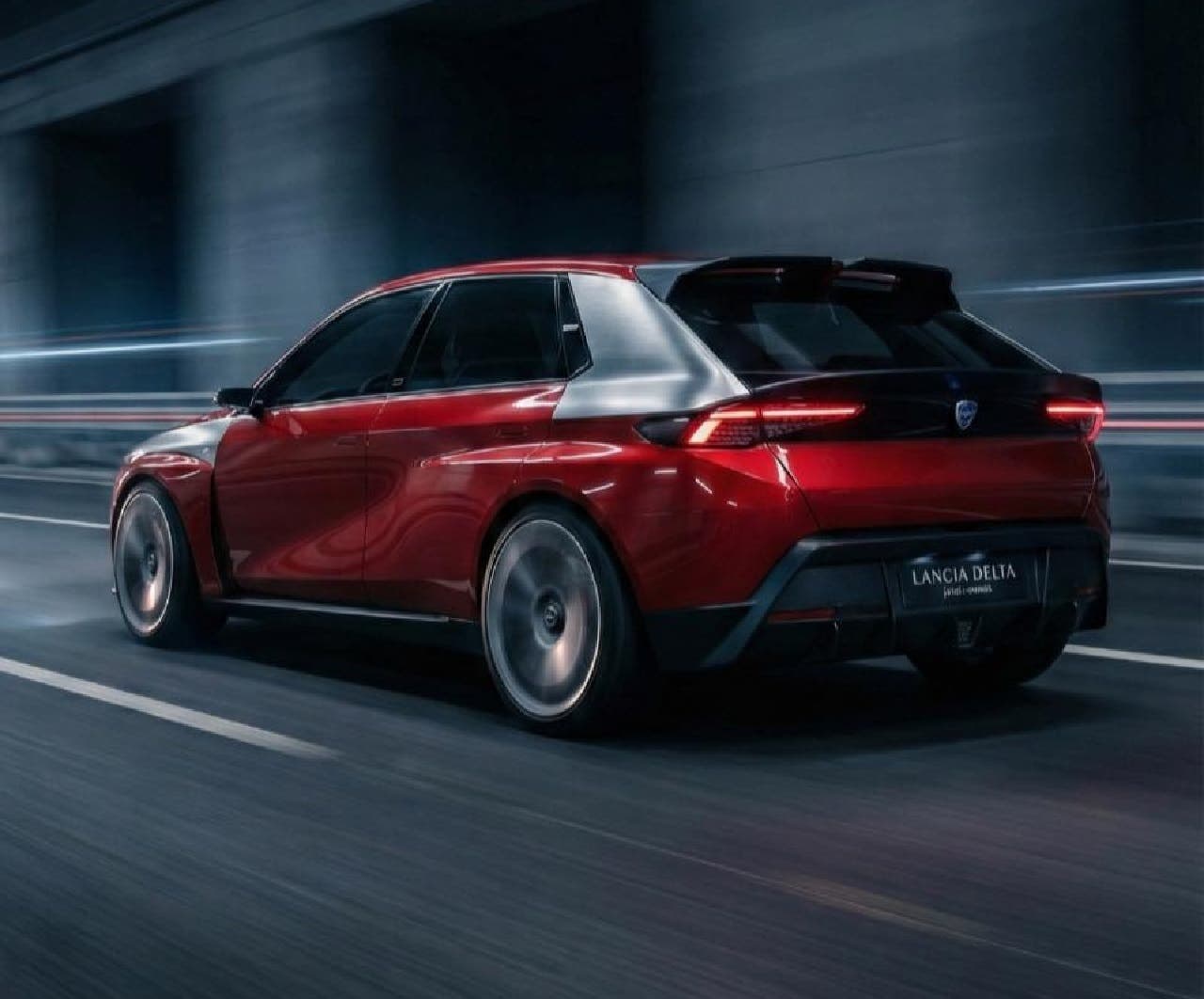 Il frontale è affilato e aggressivo, con fari sottili a LED, una firma luminosa moderna e una mascherina minimalista che integra il logo Lancia. Le superfici sono tese e pulite, con linee aerodinamiche che scorrono lungo le fiancate fino al posteriore. La vista posteriore di questa nuova Lancia Delta Integrale mostra uno spoiler pronunciato, gruppi ottici orizzontali a LED e un paraurti scolpito, che rafforza l’idea di una vettura ad alte prestazioni. I cerchi in lega di grande diametro e il setting ribassato completano un’immagine dinamica e tecnologica.