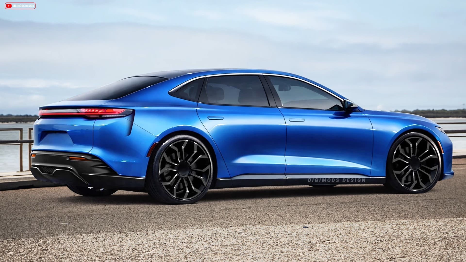 Il rendering propone una berlina premium che mescola il classico profilo a quattro porte con maniglie nascoste e cerchi neri con razze a Y. Il frontale è dominato da una sottile barra LED e una griglia quasi timida, mentre il posteriore prende in prestito con eleganza i gruppi ottici traslucidi dalla Tesla Model Y, forse sperando che un po’ di quel successo elettrico passi alla vecchia gloria americana.