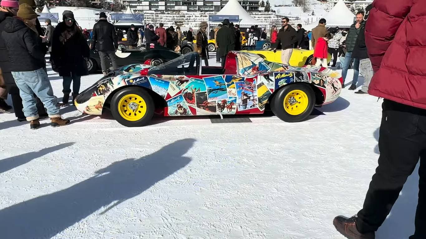 Altrettanto prestigiose ed esclusive le vetture presenti nelle altre categorie del concorso d’eleganza di The I.C.E. St. Moritz 2026, ma qui ci occupiamo della Dino 206 S, decorata come una tela. Una cosa mai vista in precedenza. Ovviamente a me piace solo nella veste standard: il resto produce solo allergia, più o meno forte. Chi mi conosce sa che non era neppure il caso di sottolinearlo, ma il proprietario avrà avuto le sue buone ragioni per conciarla in questo modo in vista dell’appuntamento svizzero. Immagino sia stato un tributo a qualcosa, ma al momento non conosco le motivazioni.