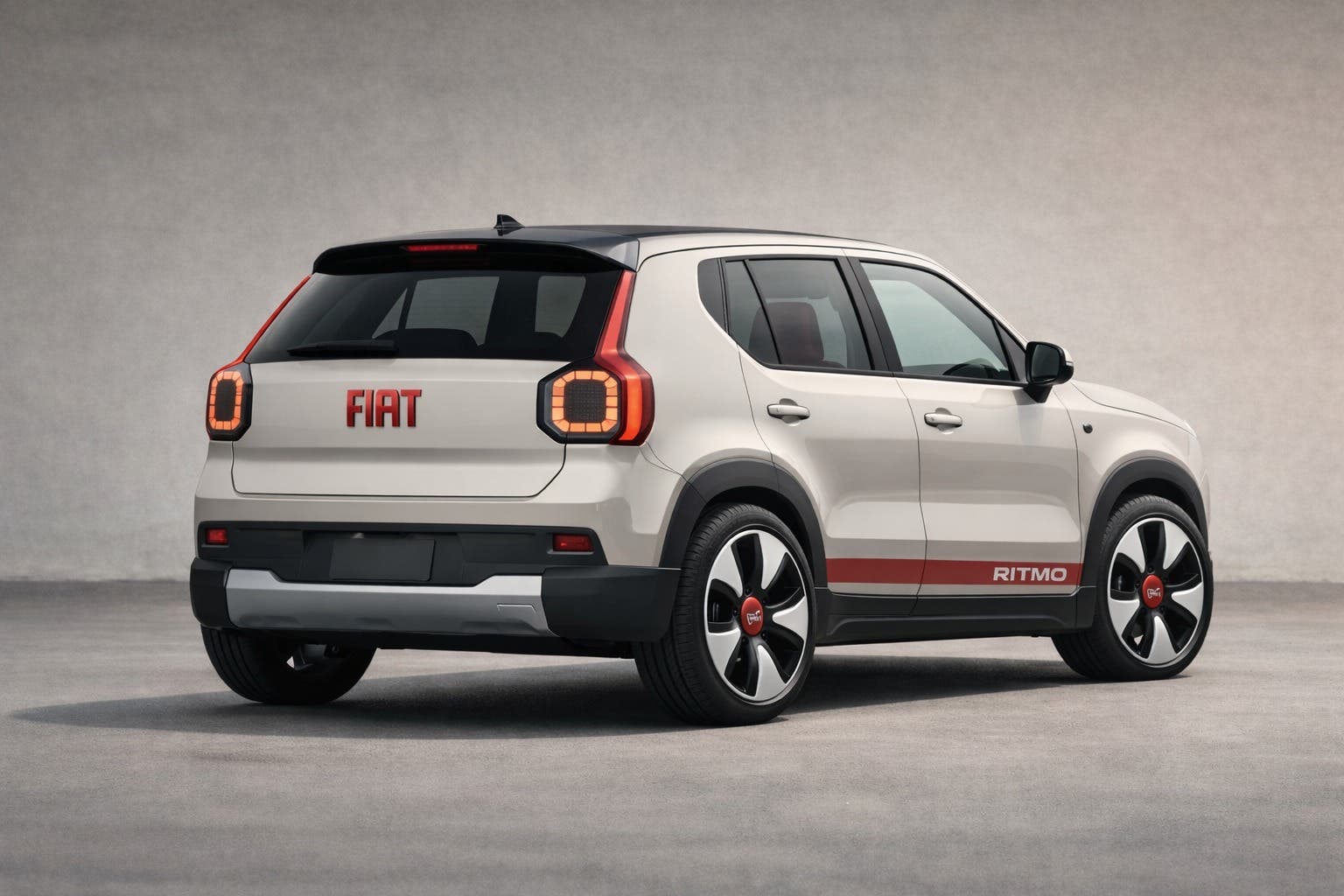 Di profilo, la nuova Fiat Ritmo immaginata dall’IA mostra passaruota pronunciati, protezioni in plastica nera e cerchi in lega di grande diametro dal disegno geometrico, con dettagli rossi che donano un tocco sportivo. Una fascia laterale con la scritta “Ritmo” rafforza l’identità del modello. Il tetto a contrasto e i montanti scuri contribuiscono a un aspetto solido e contemporaneo.