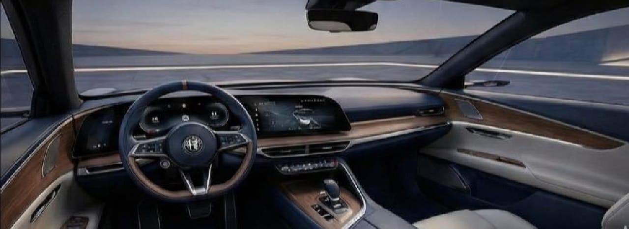 Anche l’abitacolo di questa ipotetica ammiraglia Alfa Romeo, visibile nel render, segue la stessa filosofia. L’impostazione è moderna ma calda, con materiali di pregio, inserti in legno e un layout orientato al guidatore. Il cruscotto digitale e lo schermo centrale sono integrati con discrezione, senza dominare la scena, mentre il volante sportivo richiama la tradizione Alfa.