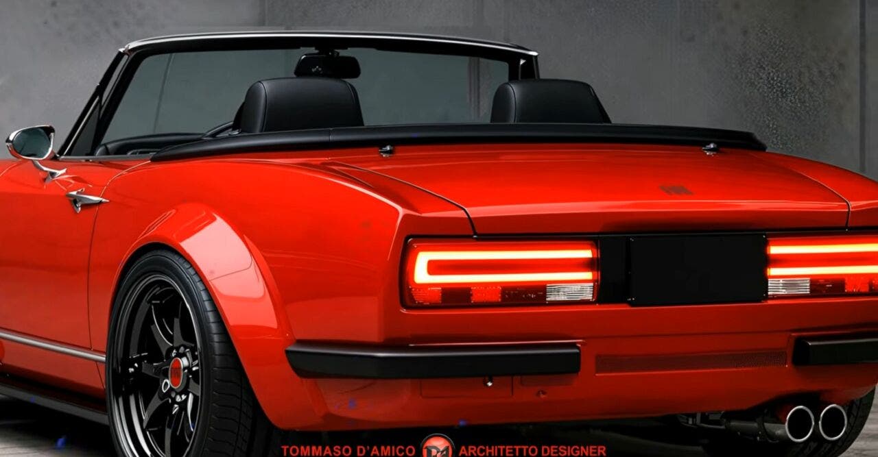 Le proporzioni iconiche vengono rispettate, ma reinterpretate attraverso un assetto più basso, carreggiate ampliate e passaruota più pronunciati, elementi che donano alla vettura un’impronta solida e dinamica. Il frontale di questa ipotetica nuova Fiat 124 Spider Corsa restomod riprende i classici fari rotondi, rielaborati con finitura scura, inseriti in un paraurti pulito arricchito da uno splitter funzionale. Il cofano in tinta scura e i particolari tecnici lasciati in evidenza accentuano l’anima racing. Al retrotreno, una firma luminosa orizzontale essenziale, il paraurti nero opaco e un estrattore sportivo con doppio terminale di scarico richiamano l’estetica delle competizioni del passato, reinterpretata con linguaggio attuale.