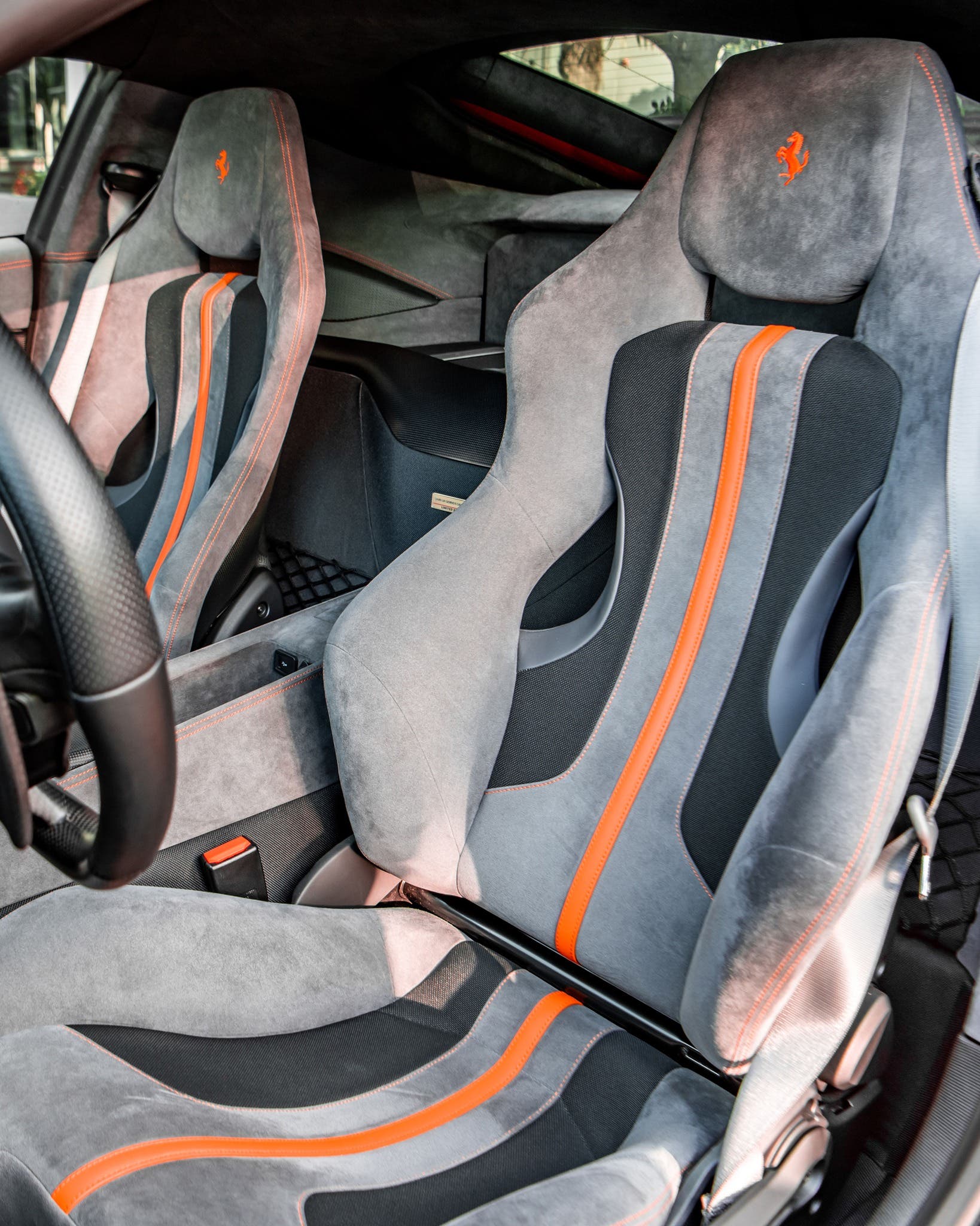 Trattata col programma “Atelier”, questa sportiva del “cavallino rampante” vanta ulteriori specifiche, come gli accenti storici GTO Livery Canna di Fucile, gli interni rifiniti in Alcantara color antracite con strisce in pelle Arancio Hermès, le cuciture a contrasto e una quantità imprecisata di finiture su misura, che ne fanno un pezzo davvero unico e distintivo. In questo quadro, i cerchi ruota in fibra di carbonio diventano quasi un elemento ordinario, anche se non lo sono affatto.