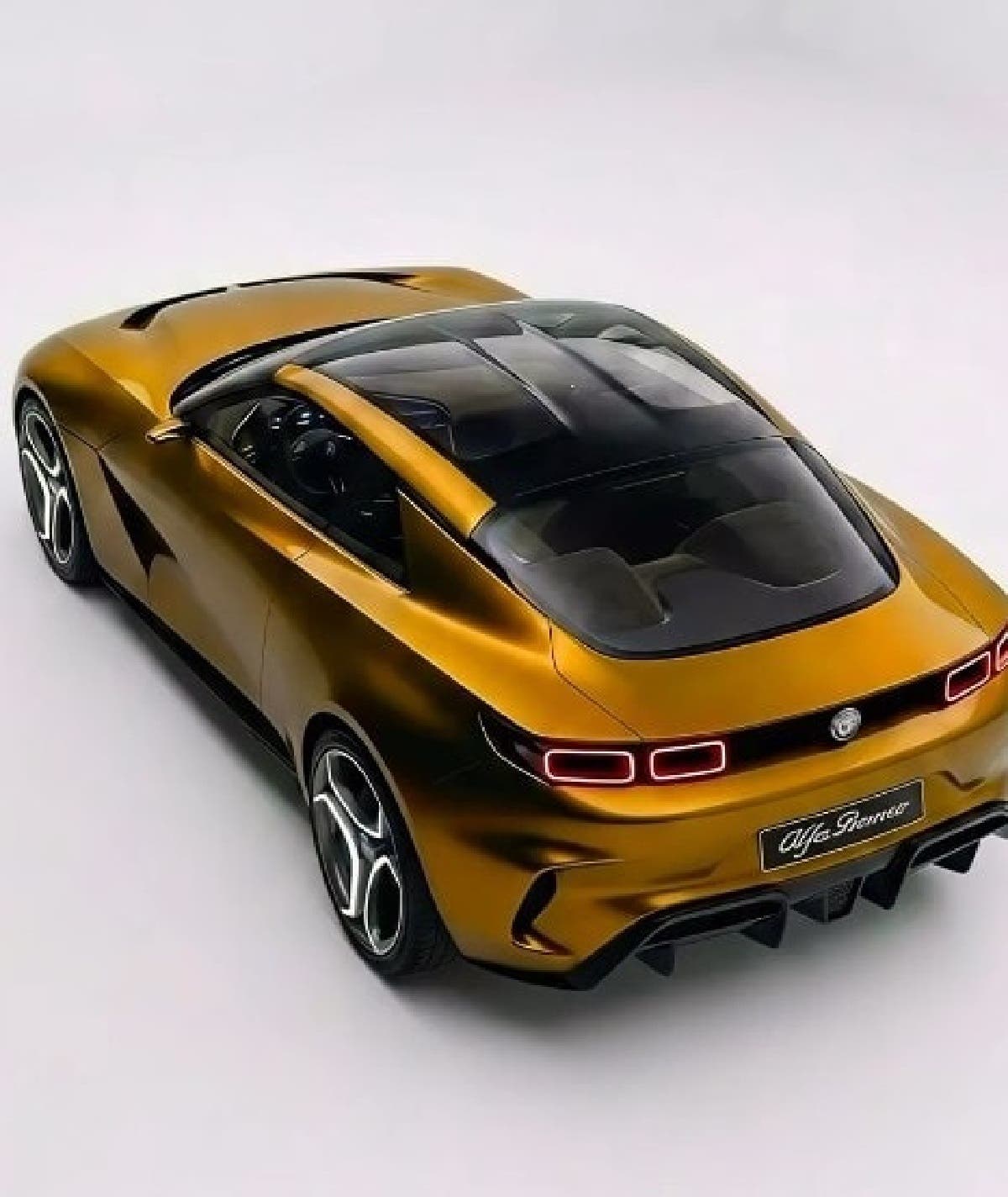 Anche di profilo questa ipotetica Alfa Romeo Quadrifoglio Concept evidenzia proporzioni compatte ma muscolose, con passaruota pronunciati e cerchi dal design elaborato. La linea del tetto scende in modo fluido verso il posteriore. Qui tra le novità più interessanti notiamo la presenza di un grande diffusore, un paraurti scolpito con prese d’aria integrate e nuovi gruppi ottici posteriori a LED dalla forma quadrata, soluzione che ipotizza una evoluzione del linguaggio stilistico del marchio rispetto a quello attuale. Infine spicca anche la presenza di un tetto in vetro che contribuisce a rendere lo stile di questa auto ancora più moderno.