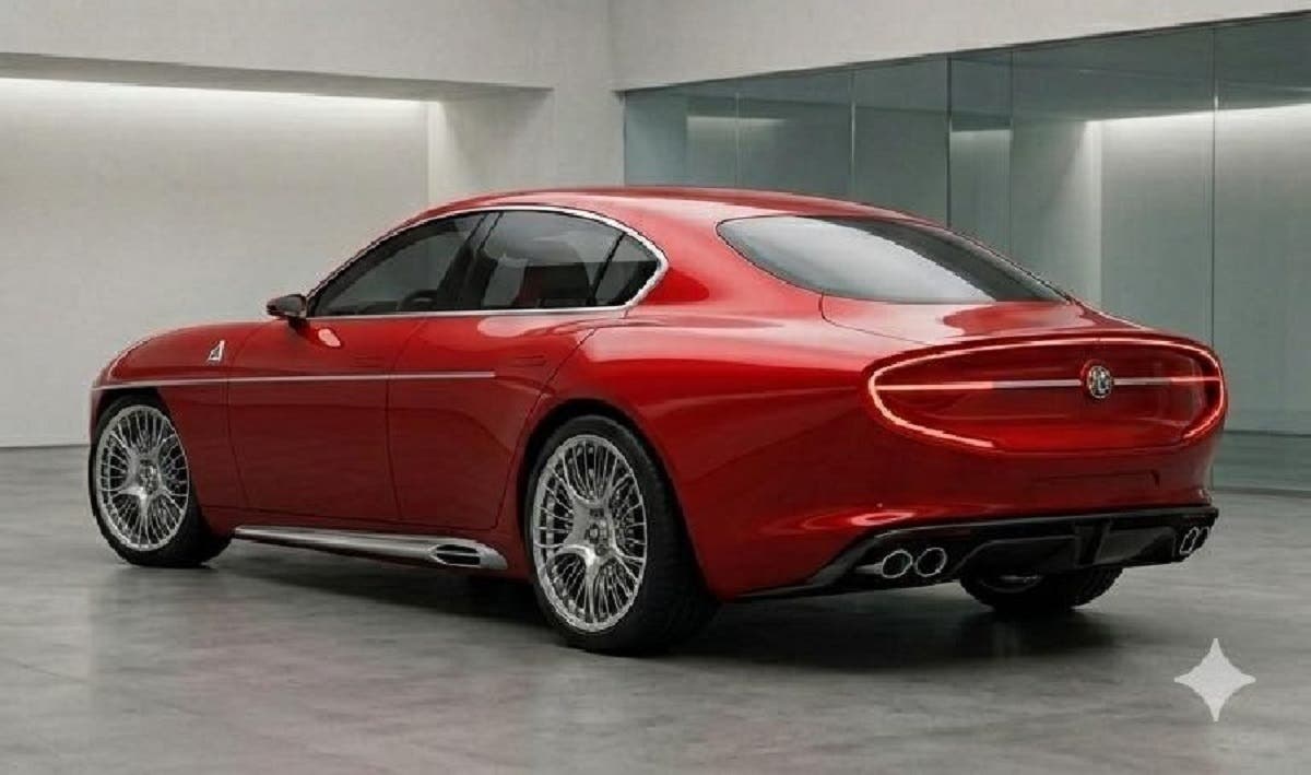 Nel render che mostra la parte posteriore di questo ipotetico modello emerge una coda morbida e avvolgente, con richiami evidenti alla Alfa Romeo Disco Volante per il trattamento delle superfici. Il gruppo ottico posteriore si sviluppa in una forma ovale continua che abbraccia il logo centrale, una soluzione molto scenica e distintiva. In basso, il paraurti integra un diffusore scuro e quattro terminali di scarico, dettaglio che rafforza il lato sportivo della vettura.
