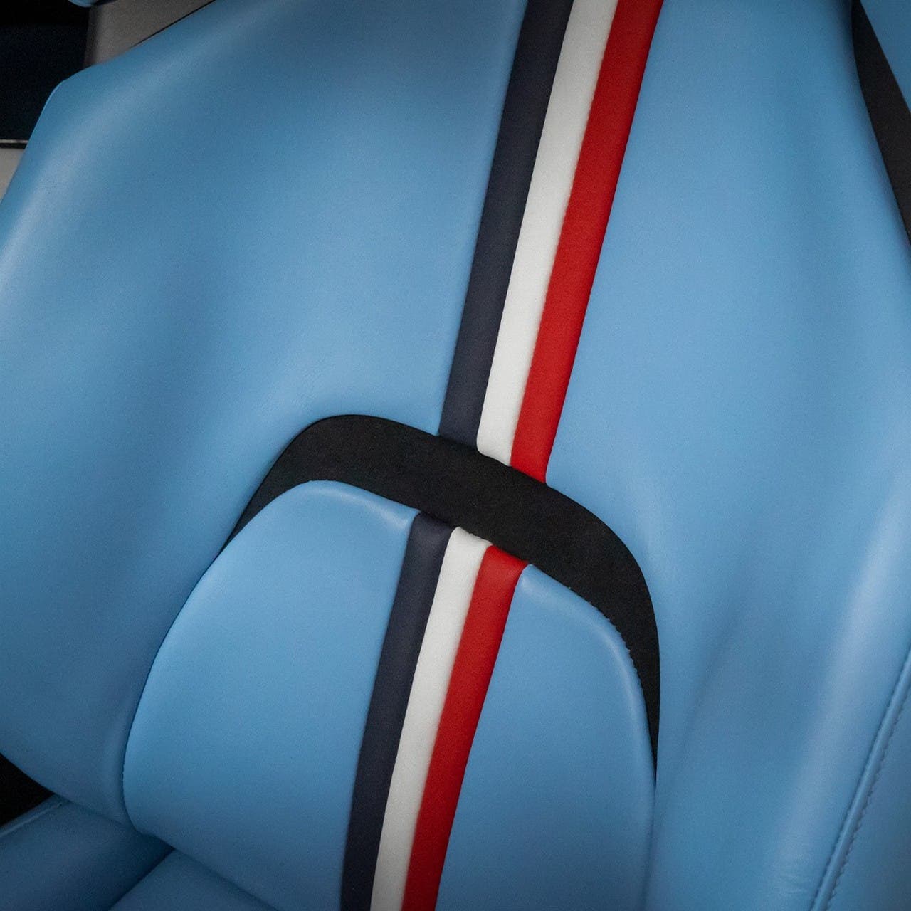 L’effetto scenico così ottenuto torna a ribadirsi nell’abitacolo, dove il colore esterno si ritrova sui sedili in pelle Foglizzese, spezzati a metà dal tricolore francese che scorre nel senso della lunghezza, in un quadro generale dove i toni del bianco, ben rappresentati, creano un legame cromatico di forte presa dialettica. Nessun dubbio sulla provenienza geografica dell’acquirente.