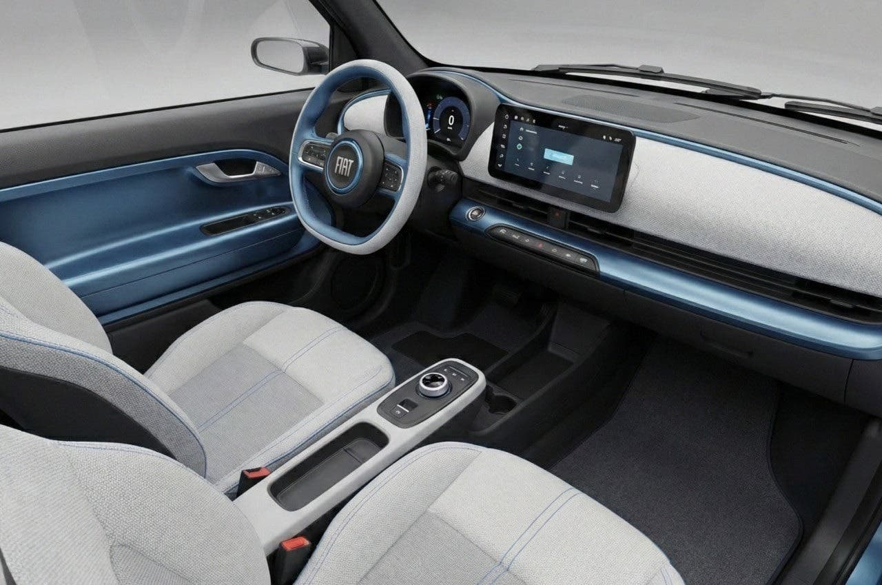 Se fuori la Nuova Fiat 126 guarda al passato, dentro cambia completamente registro. L’abitacolo si allontana dall’impostazione spartana dell’originale e adotta soluzioni molto più moderne, ispirate alle attuali citycar Fiat. Spiccano il volante di nuova generazione, il sistema di infotainment con display centrale e i comandi del climatizzatore posizionati sotto lo schermo. Il quadro strumenti compatto dietro al volante è uno dei pochi richiami diretti al modello storico, mentre i sedili sportivi con poggiatesta integrati completano un ambiente più ricercato e tecnologico.