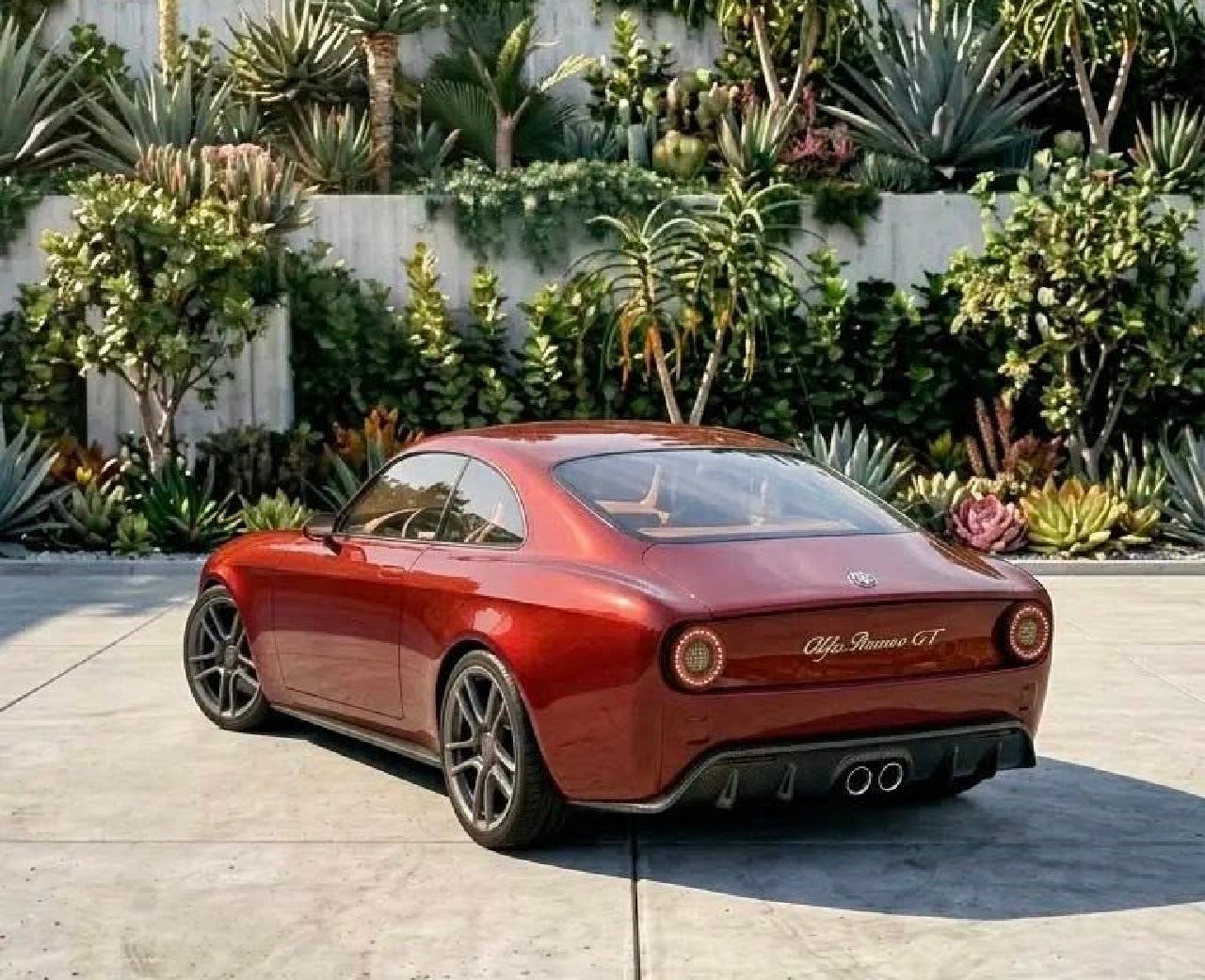 La carrozzeria di questa ipotetica nuova Alfa Romeo GT Concept, proposta in una tonalità rosso scuro molto intensa, accentua ulteriormente il carattere dell’auto. Le fiancate sono levigate, prive di eccessi, con un trattamento delle superfici che punta più sull’eleganza che sull’aggressività gratuita. Anche il posteriore segue questa filosofia: pulito, raccolto, con gruppi ottici tondi e un diffusore pronunciato che introduce una nota più moderna. I due terminali centrali di scarico completano l’insieme e rafforzano l’idea di una sportiva raffinata, più da intenditori che da effetto speciale.