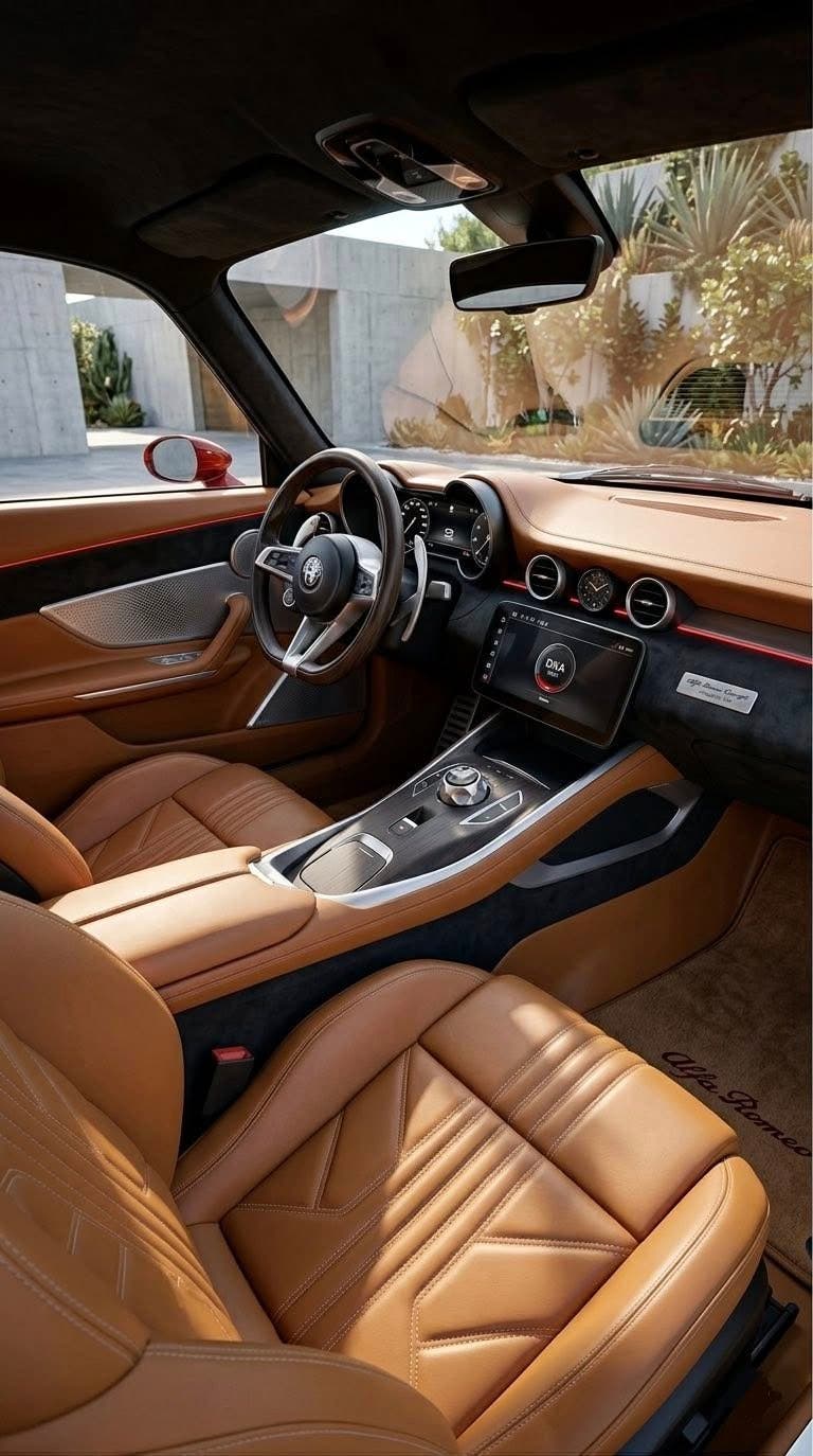 Interessante anche l’abitacolo immaginato da Callegarin. Gli interni della nuova Alfa Romeo Gt Concept mostrano un ambiente caldo e curato, dominato da rivestimenti color cuoio che rimandano immediatamente a una certa tradizione artigianale italiana. La plancia, invece, cerca un punto di contatto con il presente: strumentazione digitale, schermo centrale ben integrato e una console orientata verso il guidatore costruiscono un’atmosfera moderna ma non fredda. È un interno che sembra voler mettere insieme comfort, tecnologia e quel senso di coinvolgimento che da sempre accompagna le Alfa Romeo più riuscite.