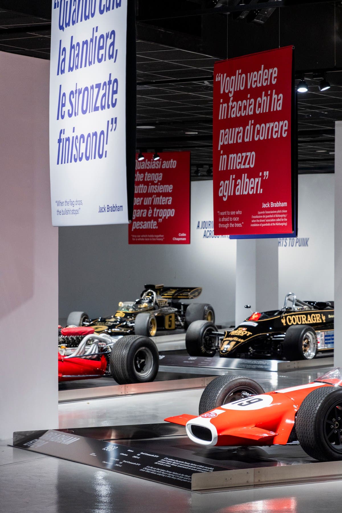 L’allestimento di cui ci stiamo occupando nasce a cura di Carlo Cavicchi e Mario Donnini, con lo sguardo di Maurizio Cilli. Tuffarsi al suo interno regala la magia di una straordinaria immersione storica nel mondo della Formula 1, mettendo in risalto le diverse culture del motorismo sportivo italiano e anglosassone. Da un lato Enzo Ferrari, alfiere della tradizione, che puntava tutto sui cavalli del motore; dall’altro le scuderie d’oltremanica, che allargavano il campo, attraverso innovazioni concettuali su fronti diversi da quello propulsivo.