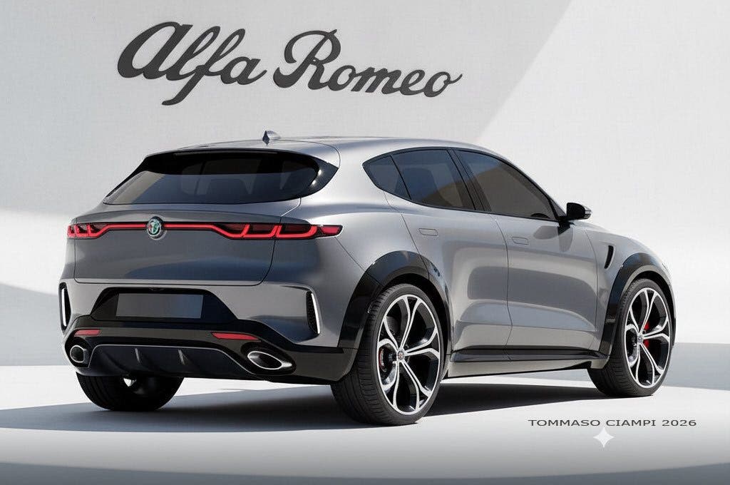 Molto riusciti anche i dettagli sportivi, come i passaruota marcati, le prese d’aria, i cerchi di grandi dimensioni e l’assetto visivamente basso, che contribuiscono a rafforzare l’identità dinamica del modello. Al posteriore spicca una firma luminosa sottile e continua, moderna ma coerente con il carattere Alfa Romeo. Nel complesso, il render propone una Tonale più matura, più grintosa e con una presenza scenica decisamente forte.
