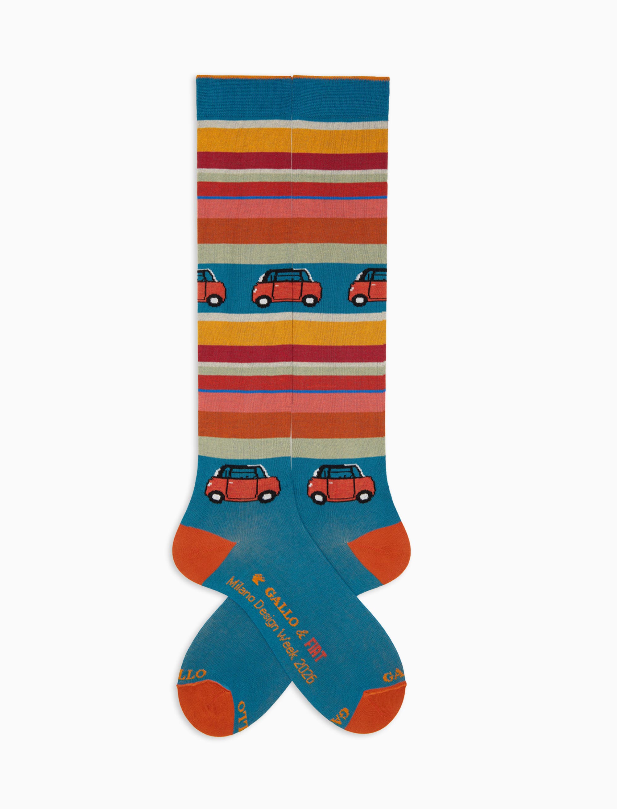La collaborazione tra la Fiat Topolino e Gallo passa anche dalle calze in cotone proposte in edizione limitata. Parliamo di due versioni speciali pensate come must-have da collezione. Una a righe multicolor che celebra le iconiche righe di casa Gallo, ponendosi accanto alla Topolino nella colorazione Corallo, e una capace di portare il mare in città con un vero e proprio fondale marino da indossare con coralli e la Topolino colore Corallo.