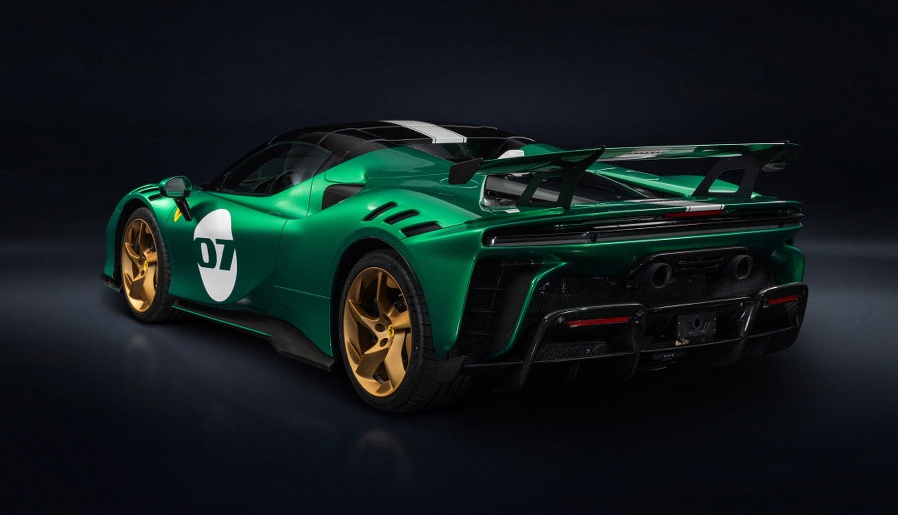 L’esemplare della scoperta del “cavallino rampante” di cui ci stiamo occupando nell’articolo brilla con la sua finitura Green Jewel lucido, completata da una livrea Bianco King e da rotondi bianchi firmati con il numero 07, inciso nel colore prevalente del corpo. I cerchi sono bronzati. Ne deriva una presenza scenica audace, allineata all’apparato genetico del mezzo, che non fa mistero della sua indole racing. Ogni dettaglio lo fa capire, cominciando dall’alettone posteriore a tutta larghezza.