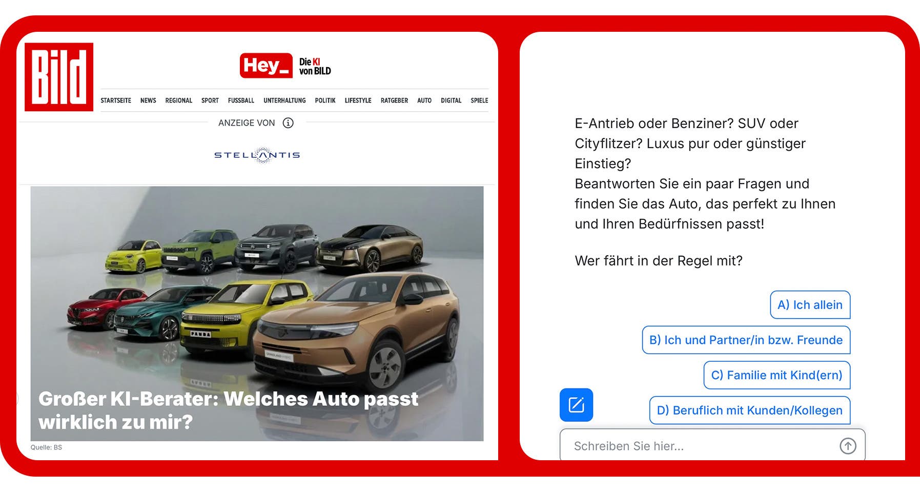 Circa il 20% di tutte le auto viene ormai venduto online. I gruppi target più giovani, in particolare, si rivolgono sempre più spesso alle fonti digitali per informarsi. Per questo motivo, Stellantis Germany sta aprendo nuove strade nelle vendite digitali sul più grande portale di notizie tedesco, BILD.de: insieme al partner di marketing di BILD, Media Impact, ha sviluppato un venditore di auto basato sull’intelligenza artificiale e sull’assistente virtuale “Hey_” di BILD. Questo assistente fornisce agli utenti consigli personalizzati e li guida direttamente attraverso il processo di acquisto.