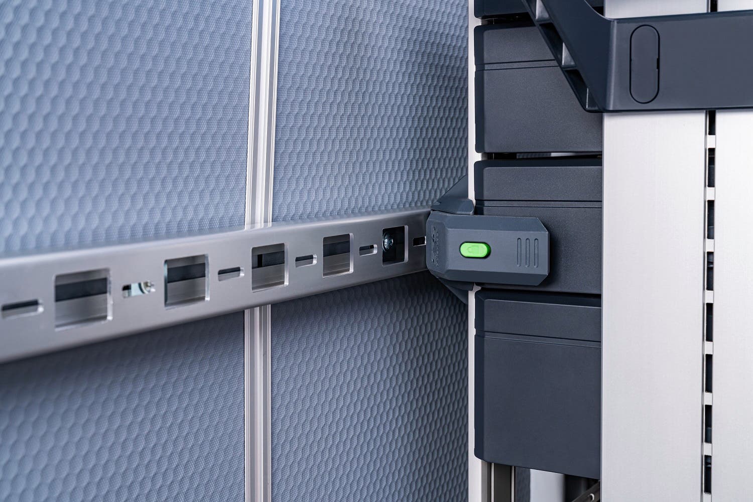 Il sistema di Sortimo svolge contemporaneamente due funzioni: non solo fissa il carico, ma funge anche da base per blocchi di scaffalatura flessibili. Questi blocchi possono essere facilmente agganciati in posizione tramite il sistema Sortimo SRS-Connect e rimossi senza attrezzi quando necessario. Ciò consente di trasformare in pochissimo tempo il furgone Stellantis Pro One in uno spazio di lavoro modulabile, adattabile alle esigenze che cambiano rapidamente durante l’utilizzo e ai diversi utenti, il tutto senza dover ricorrere a un’officina.